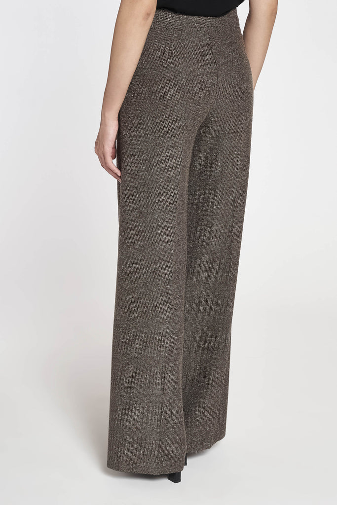 Pantalone largo in tessuto resca con vita regolare. Chiusura nascosta con lampo invisibile e gancetto di metallo interno. Tasche alla francese e piega stirata.
