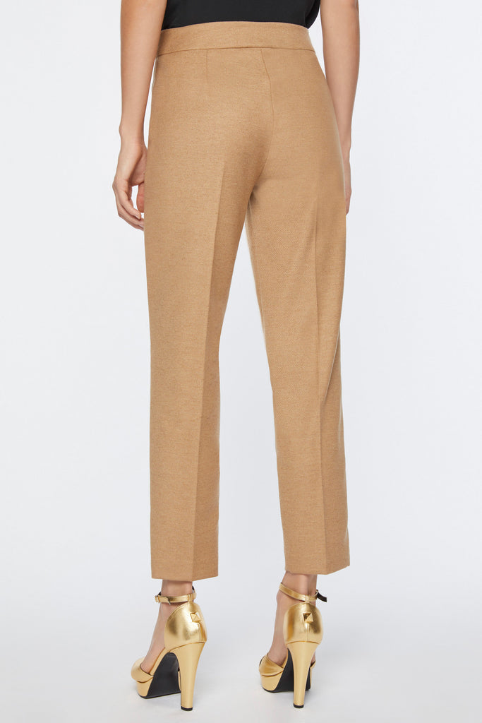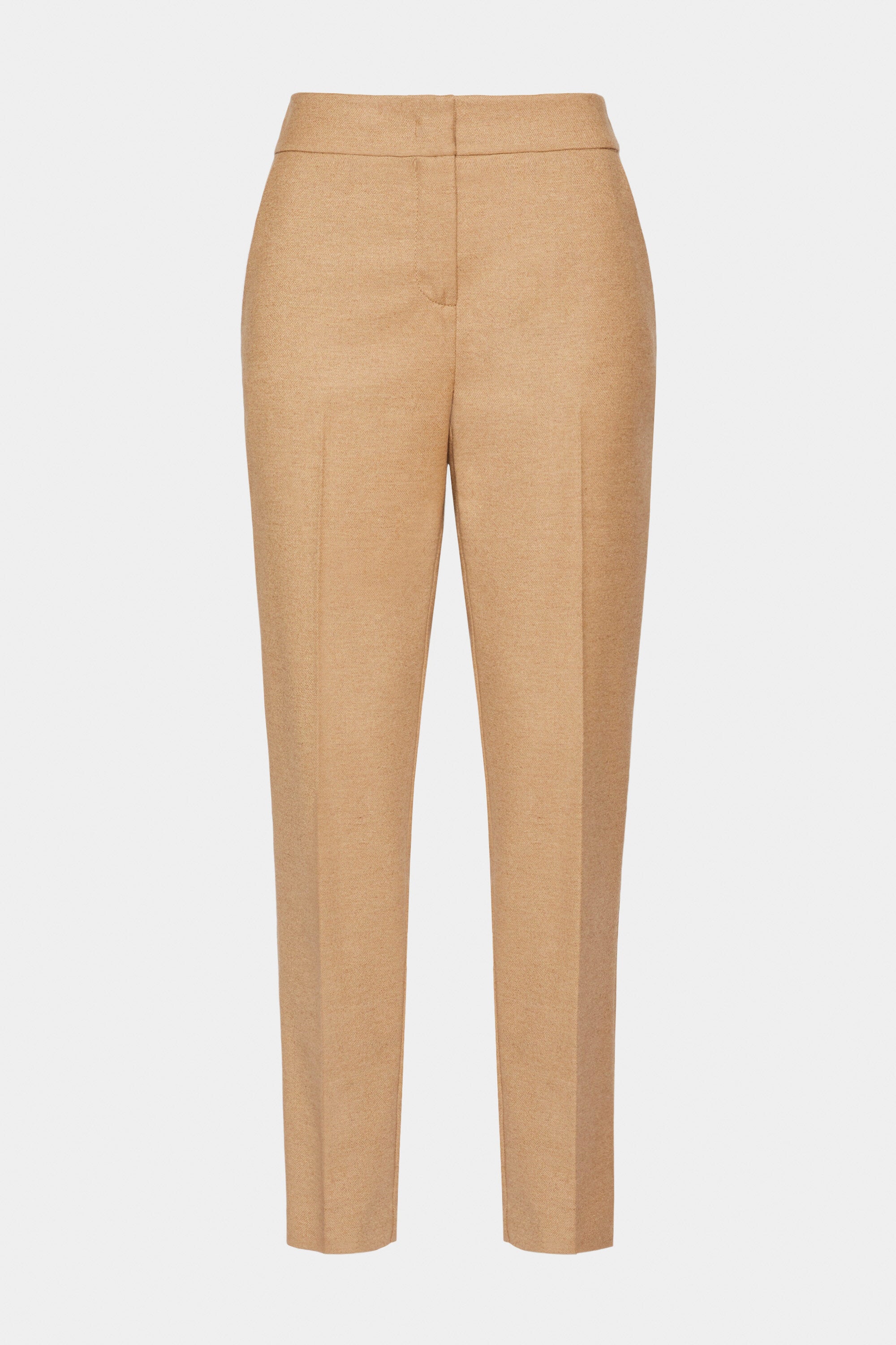 Pantaloni a sigaretta in flanella elasticizzata, con vita regolare e gamba aderente. Chiusura nascosta con lampo invisibile e gancetto di metallo interno. Tasche alla francese e piega stirata.