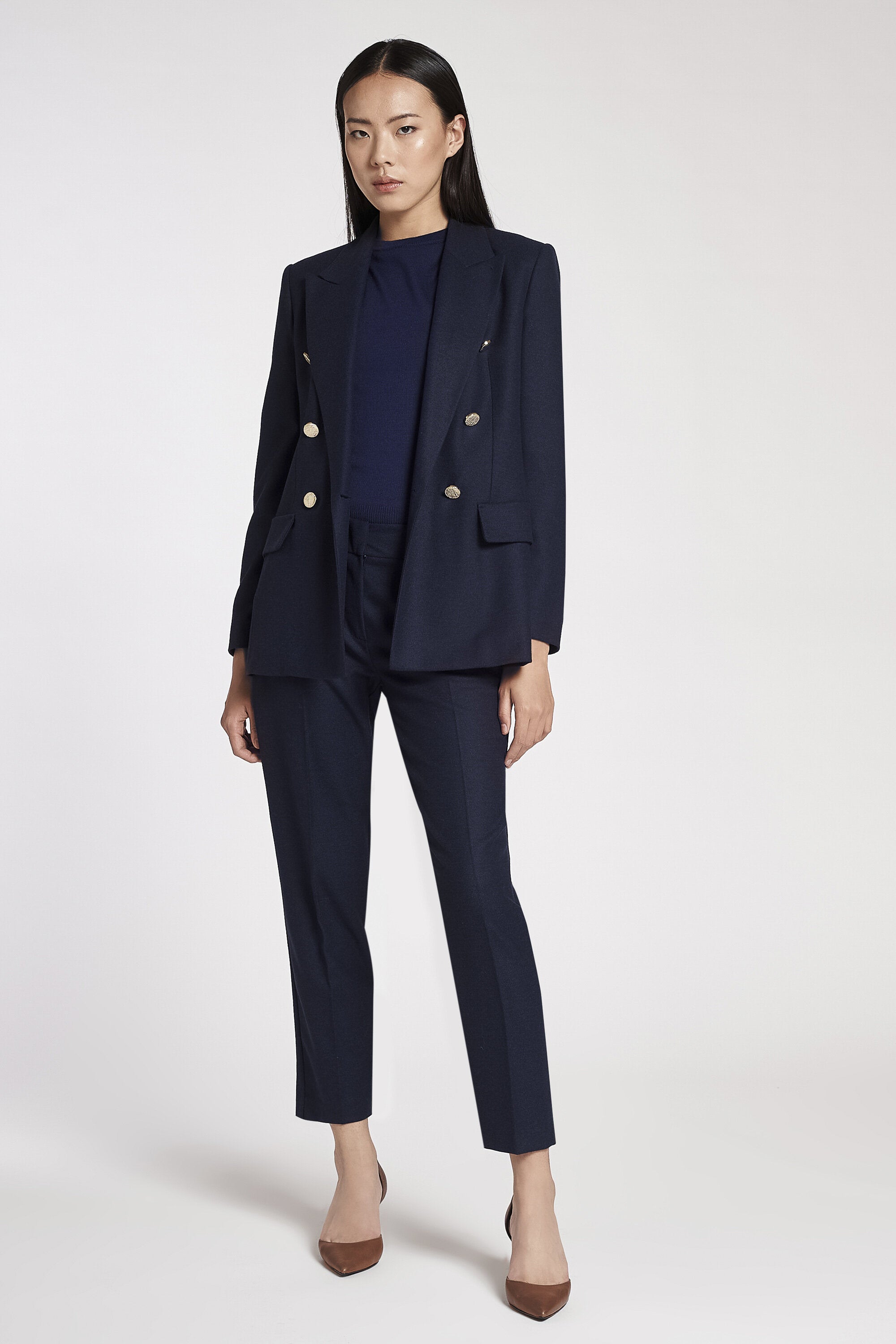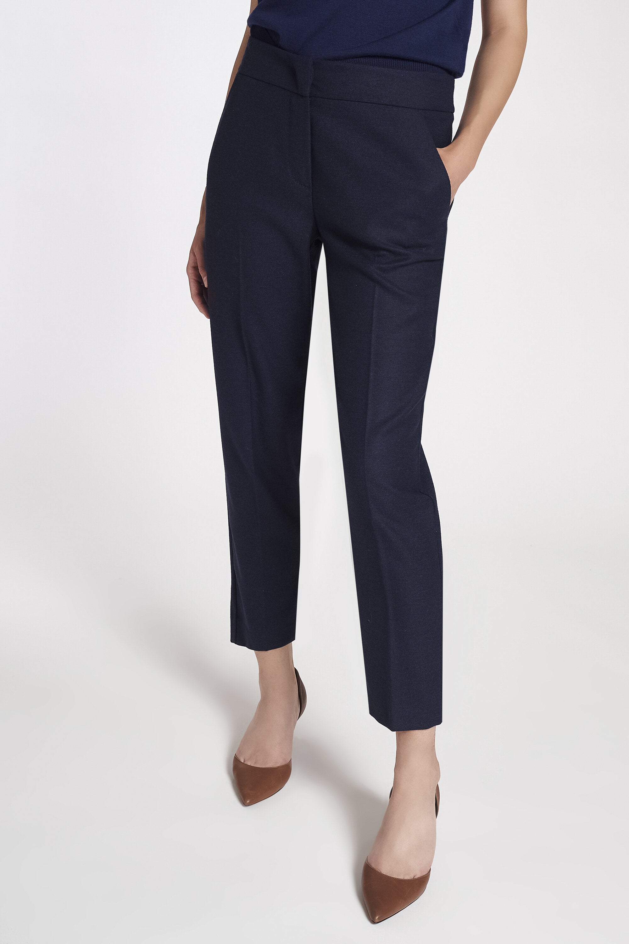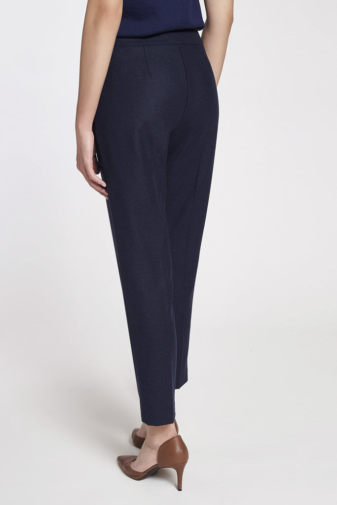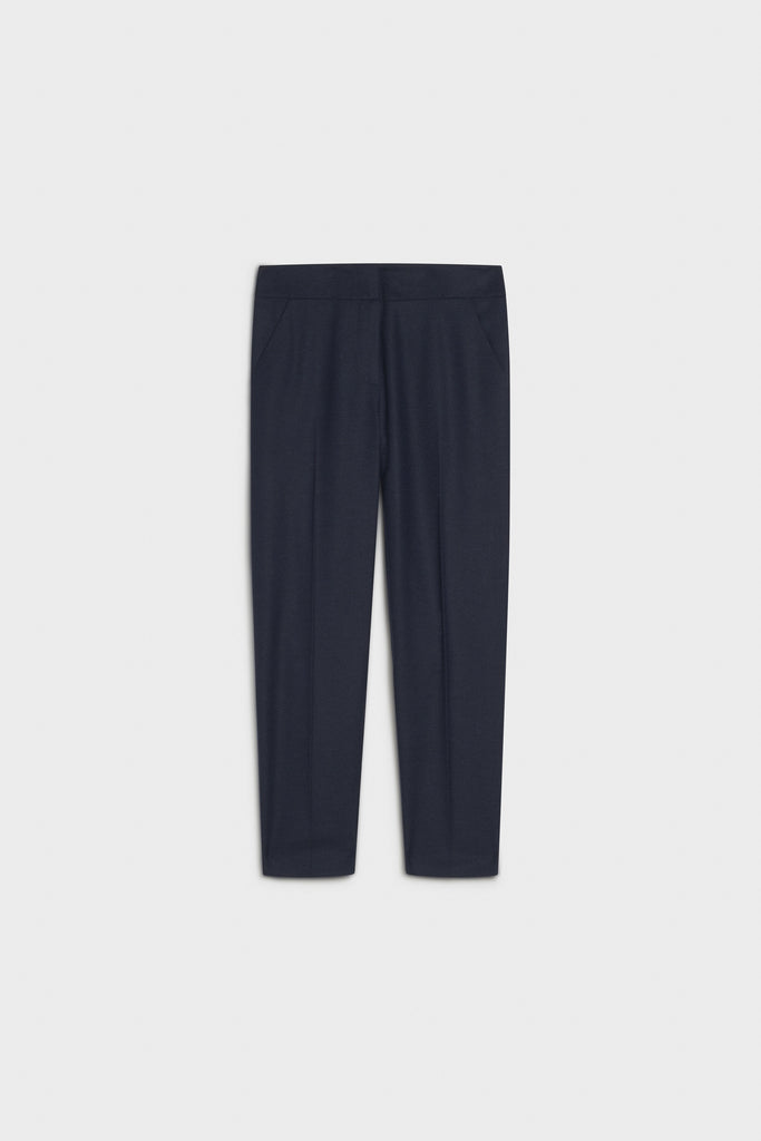 Pantaloni a sigaretta in flanella elasticizzata, con vita regolare e gamba aderente. Chiusura nascosta con lampo invisibile e gancetto di metallo interno. Tasche alla francese e piega stirata.