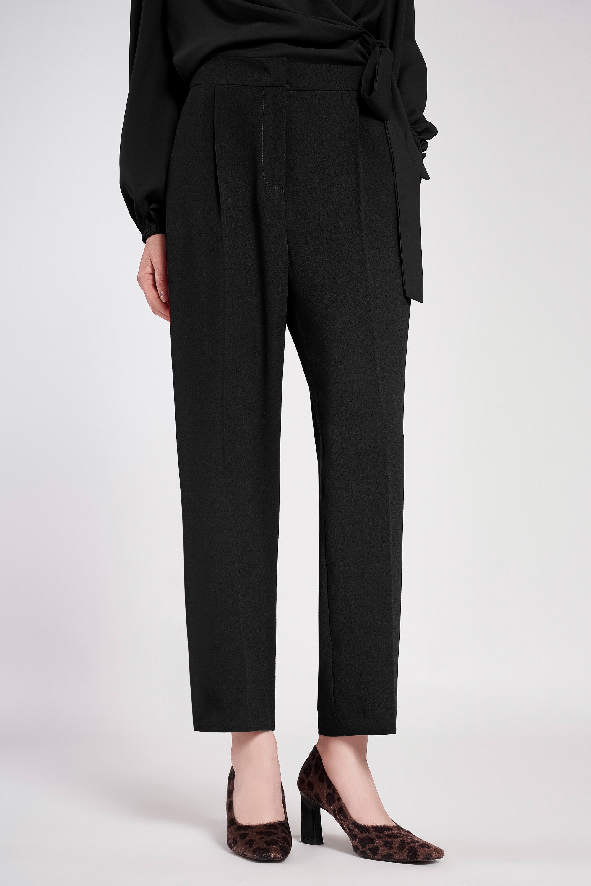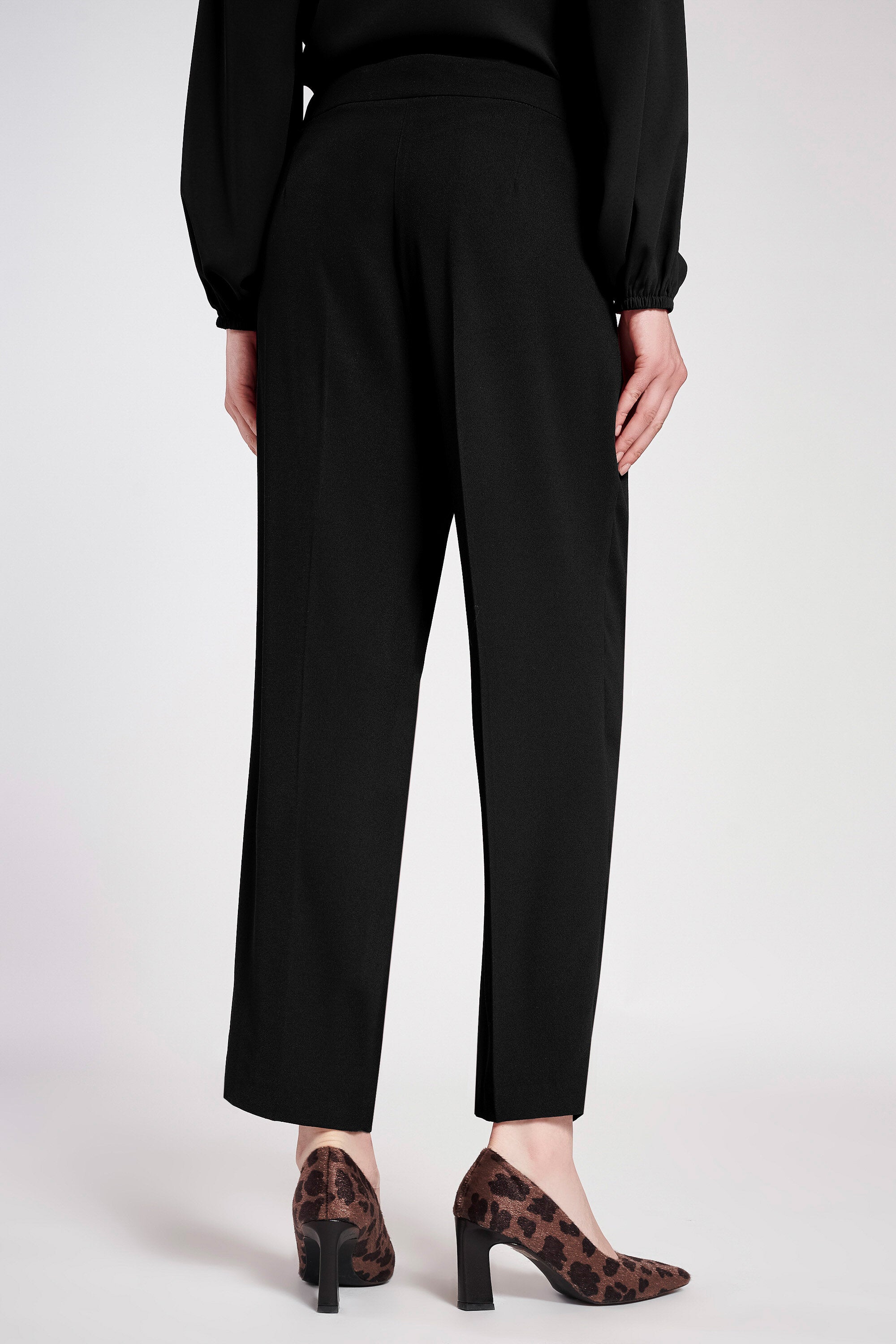 Pantaloni dalla linea dritta in crepe satin con vita e cavallo basso. Riprese in vita e chiusura nascosta con lampo invisibile e gancetto di metallo interno. Tasche alla francese piega stirata.