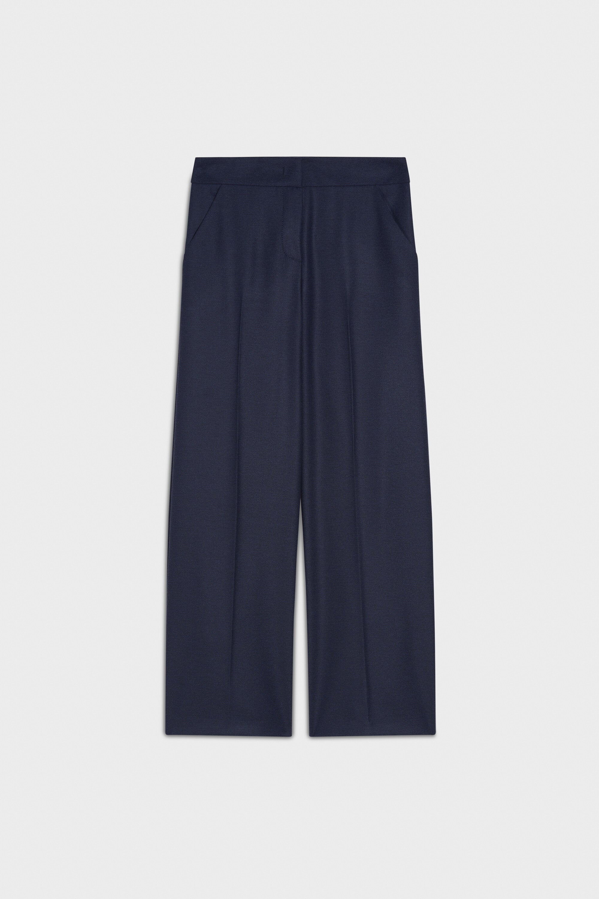 PantalonI larghi in flanella elasticizzata con vita regolare. Chiusura invisibile con lampo nascosta e gancetto di metallo interno. Tasche alla francese e piega stirata.