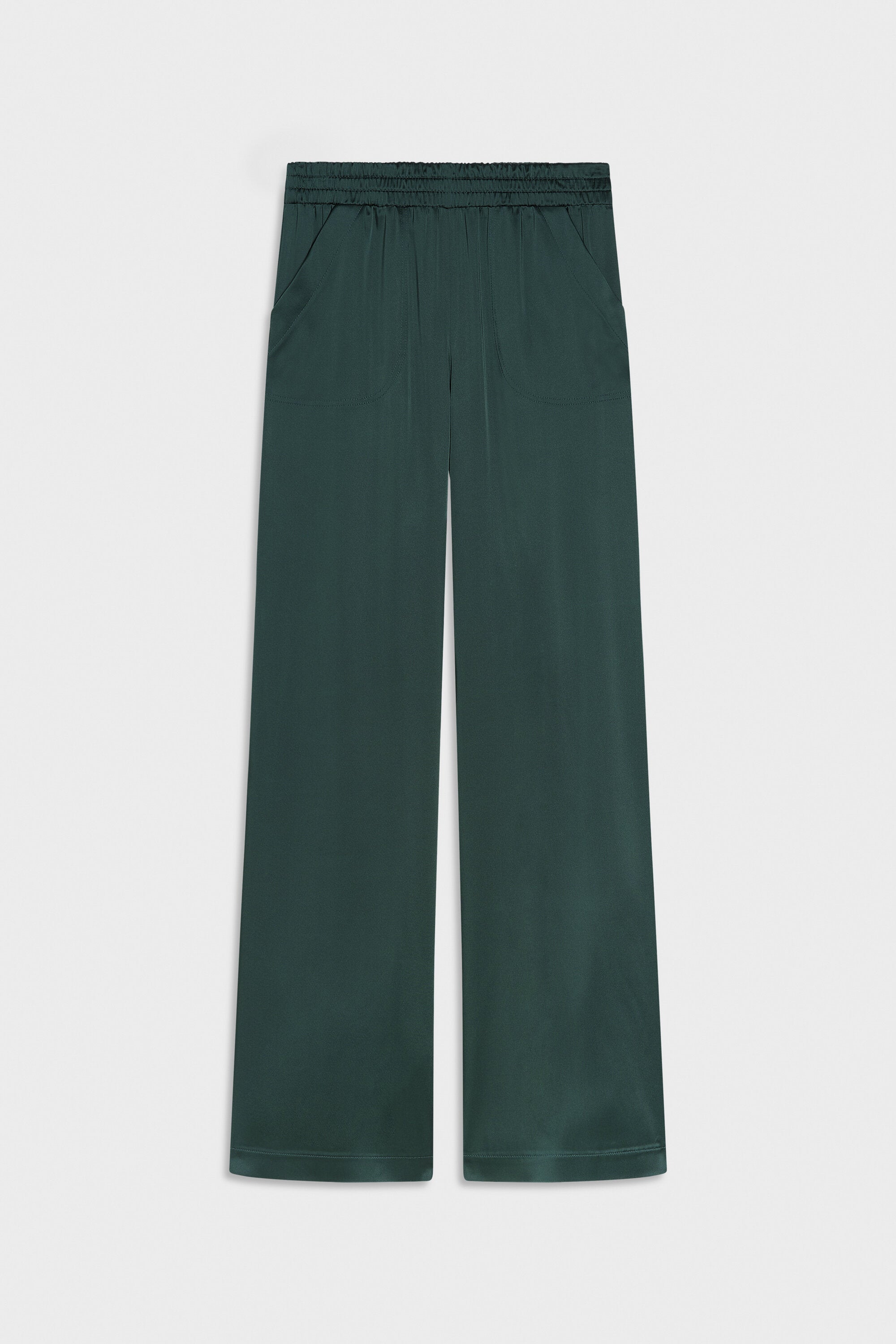 Pantaloni lunghi wide leg in raso elasticizzato. Vita bassa elasticizzata e cavallo basso. Gamba dalla linea dritta ed ampia. Tasche alla francese.