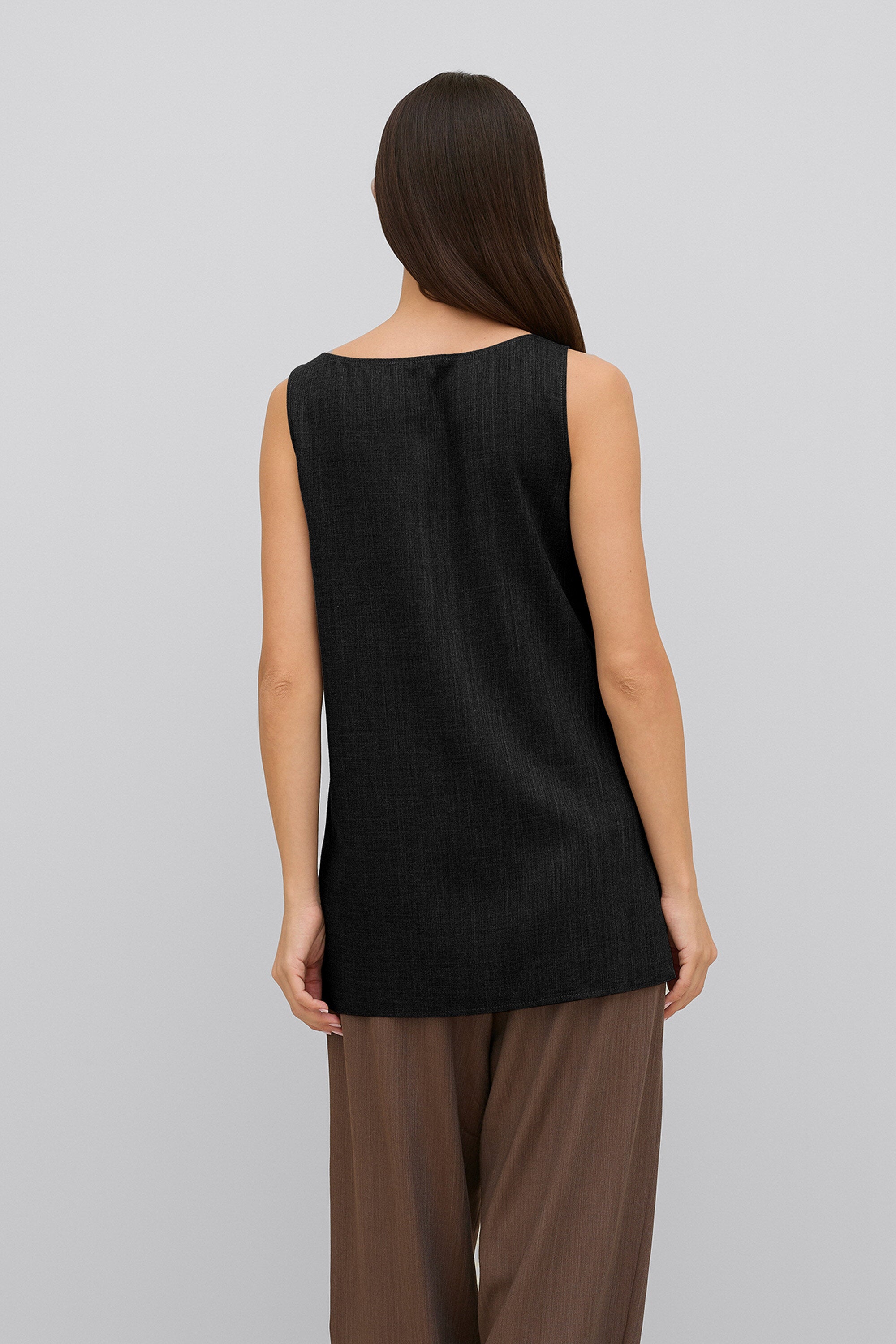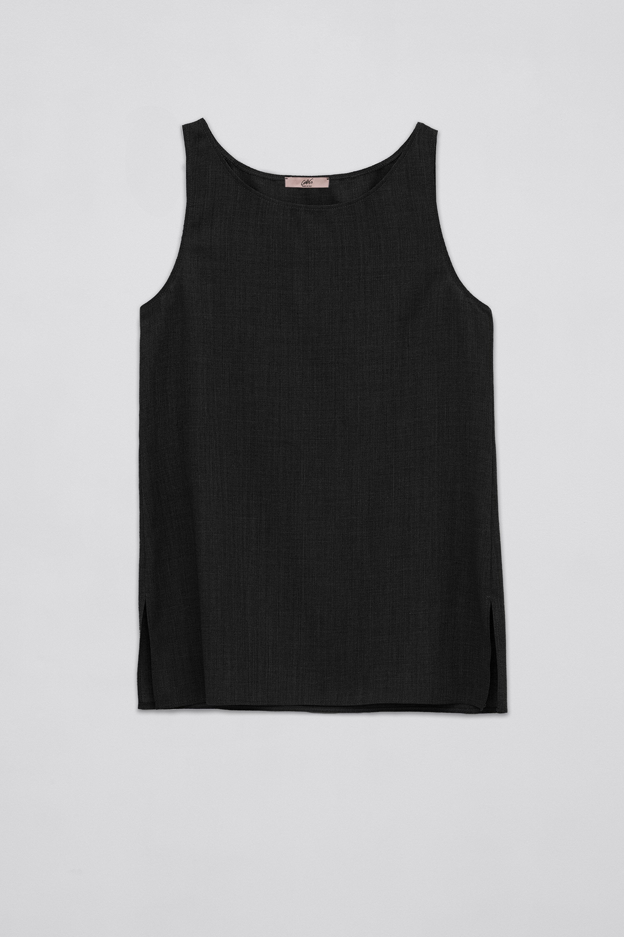 Canotta in garza di lana. Scollo rotondo e fondo con spacchetti laterali. Lunghezza sotto ai fianchi.