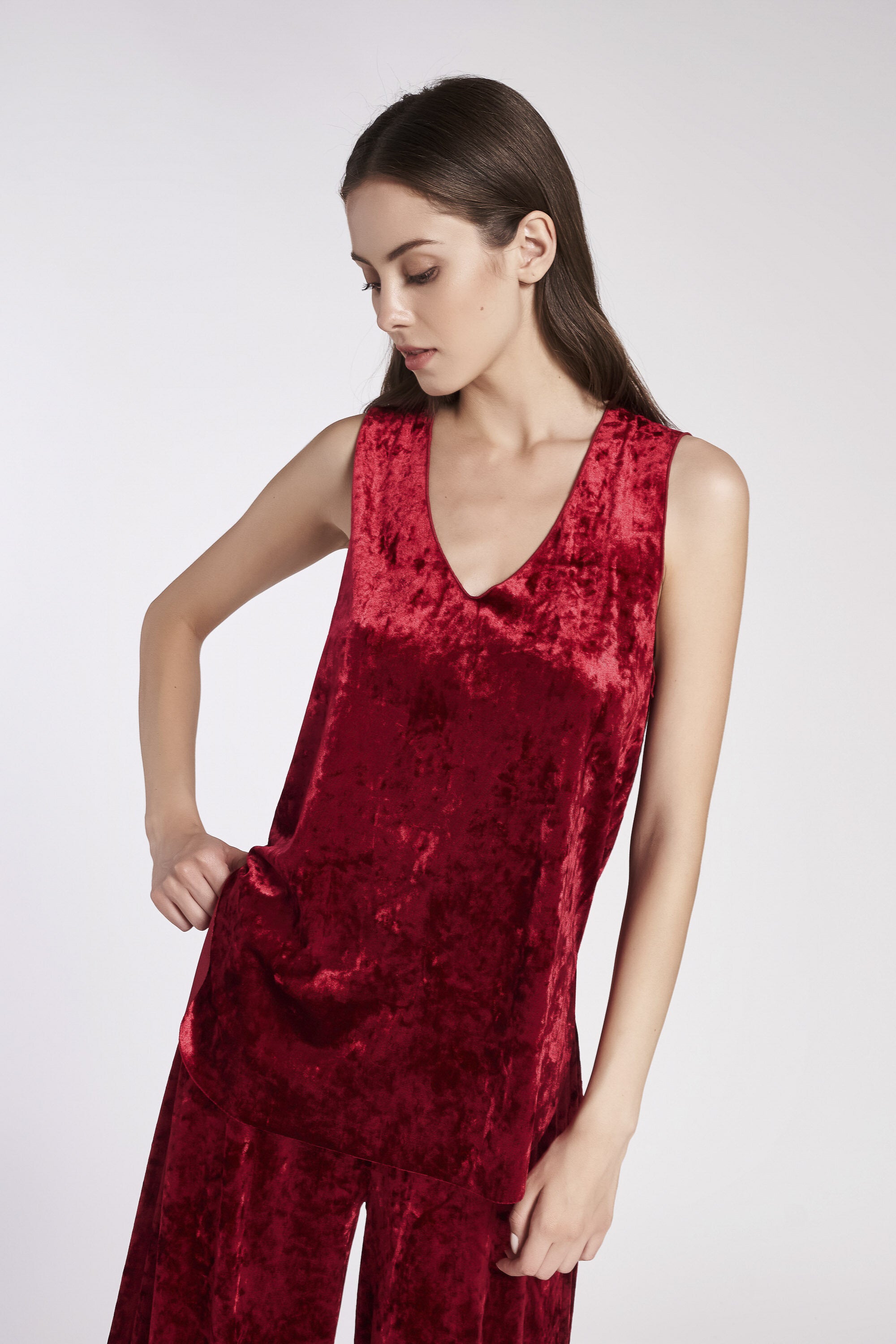 Canotta in velluto pannè elasticizzato. Scollatura a v sul davanti e spacchi laterali nei fianchi. Lunghezza sotto i fianchi.