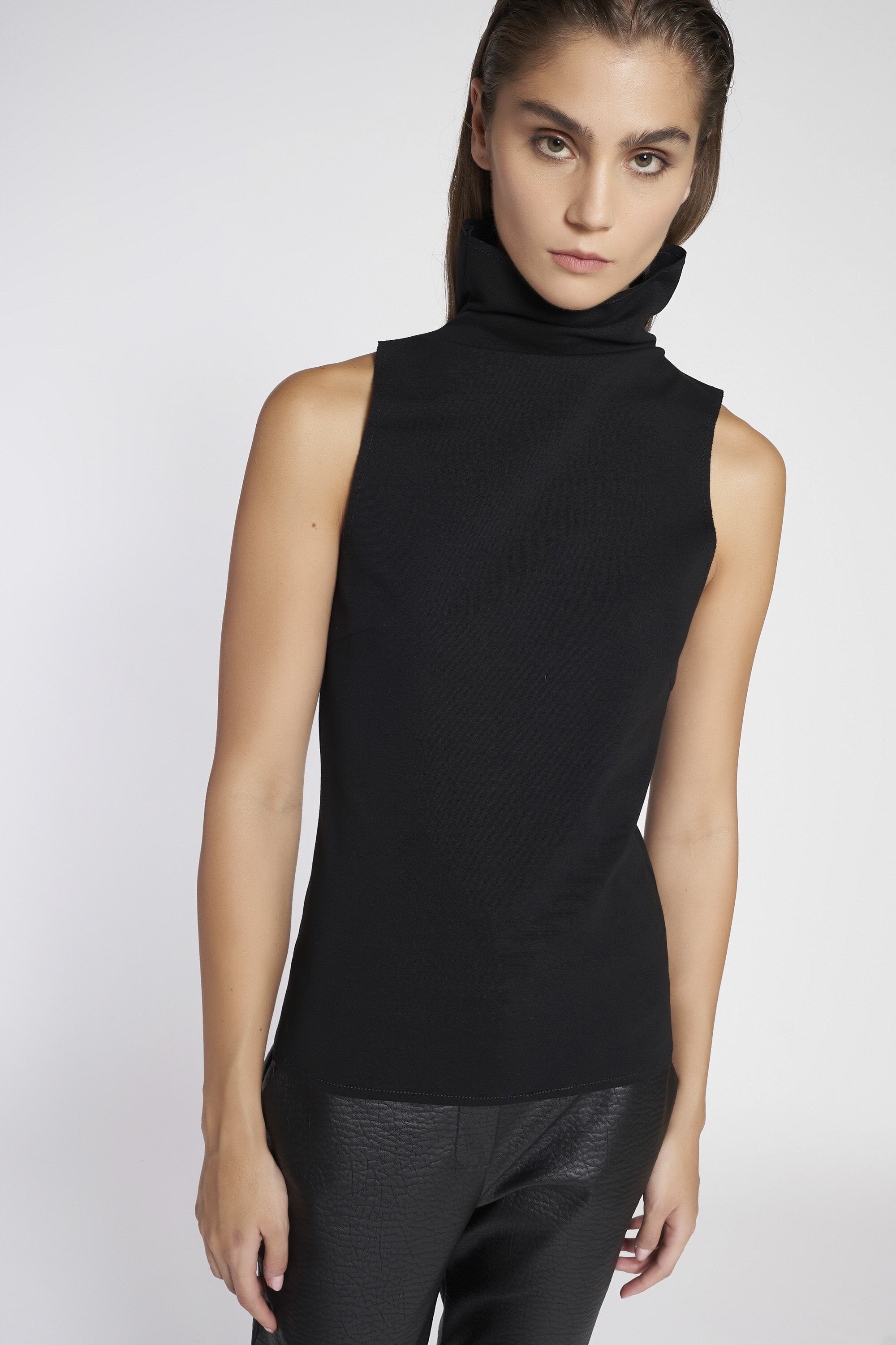 Maglia a collo alto in maglia stoffa elasticizzata. Lunghezza ai fianchi.