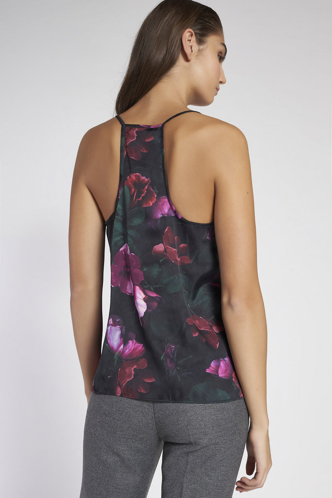 Top in raso stampa flower con scollo a v davanti ed elastico nel retro. Spalline sottili e spacchetti laterali. Lunghezza ai fianchi.