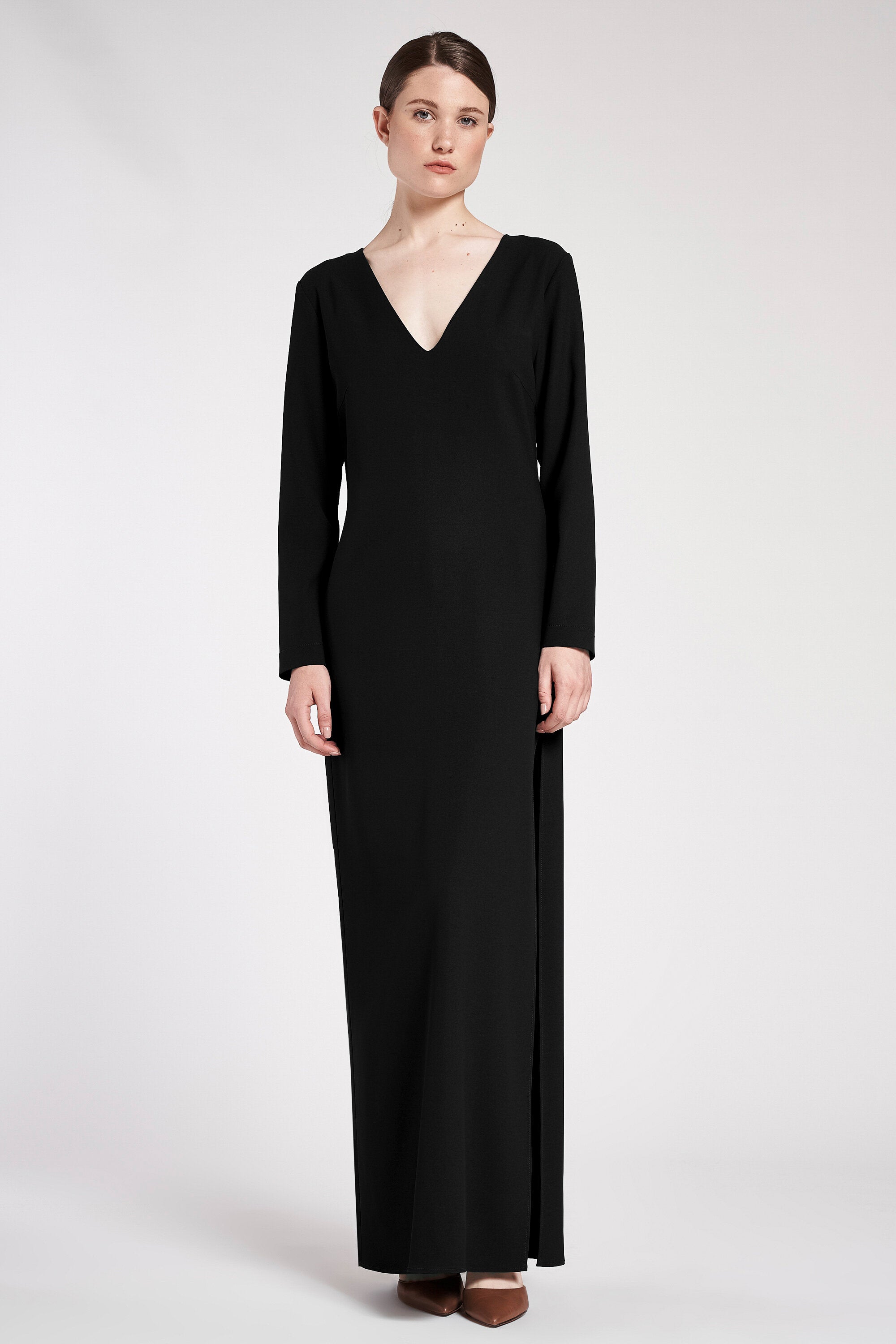 Abito a manica lunga in crepe di viscosa elasticizzato con profondo scollo a v davanti e dietro. Scollo dietro con ferma spalla e lampo nel centro dietro. Ampio spacco sul fianco.