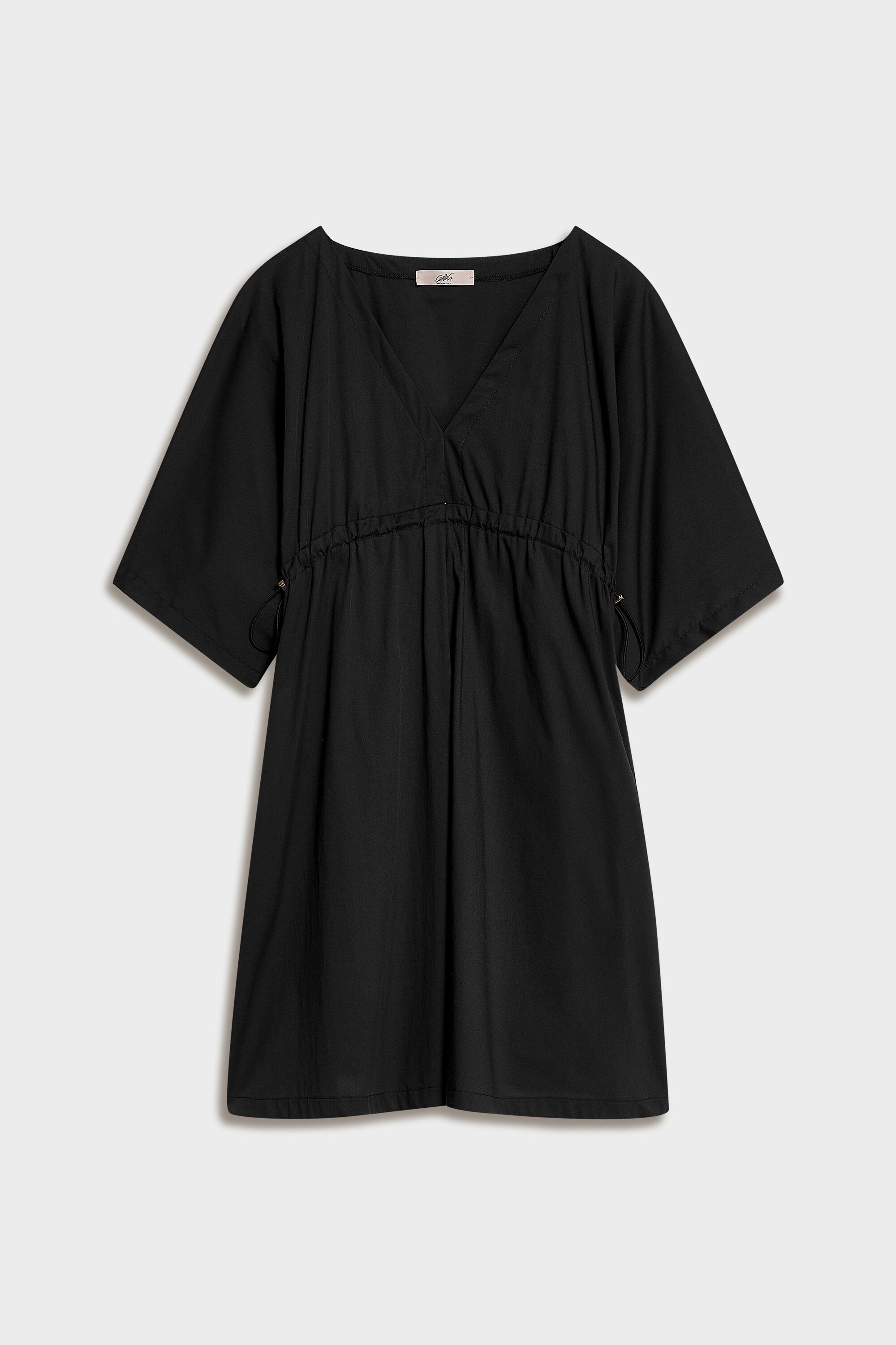 Abito corto svasato in popeline elasticizzato. Vita regolabile con elastico e fermacorda in metallo.Entrata tasche laterale. Medaglietta con logo CG nel centro dietro.