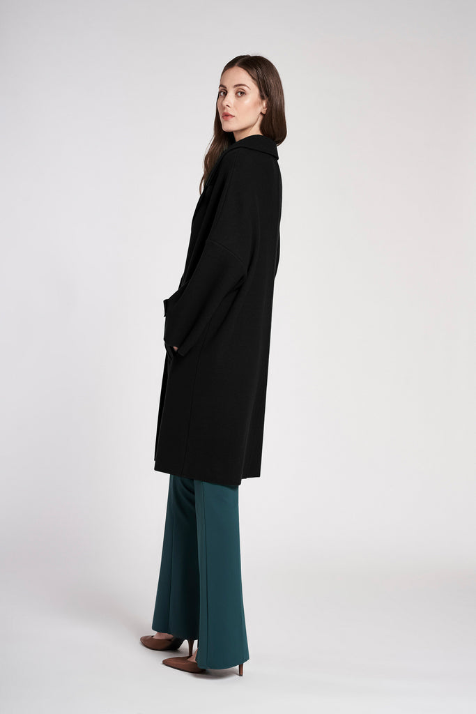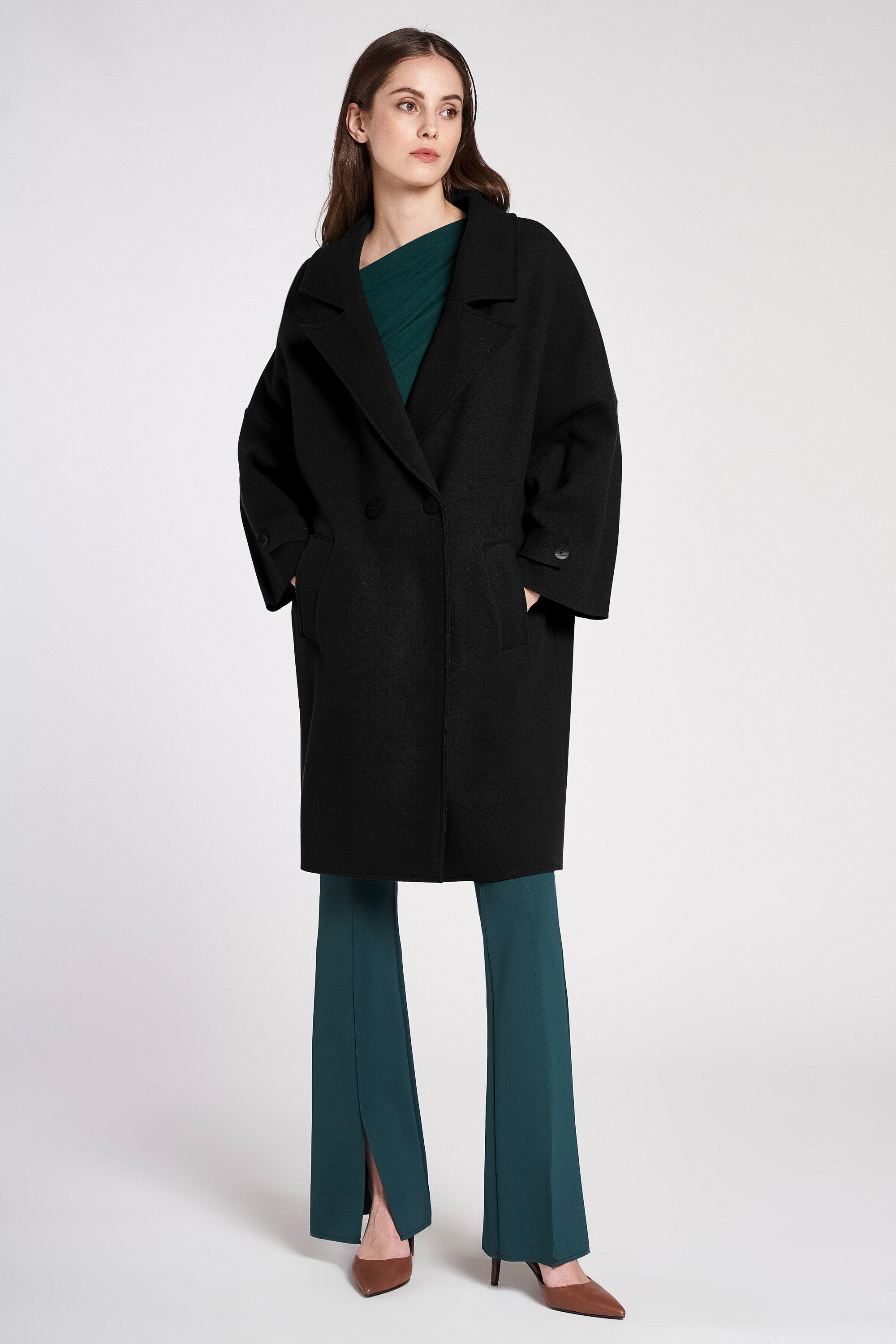 Cappotto doppiopetto sfoderato in lana mouflon con ampio scollo a revers e chiusura con bottoni in madreperla. Tasche a filetto e mostrine nei fondi manica. Lunghezza sotto il ginocchio.
