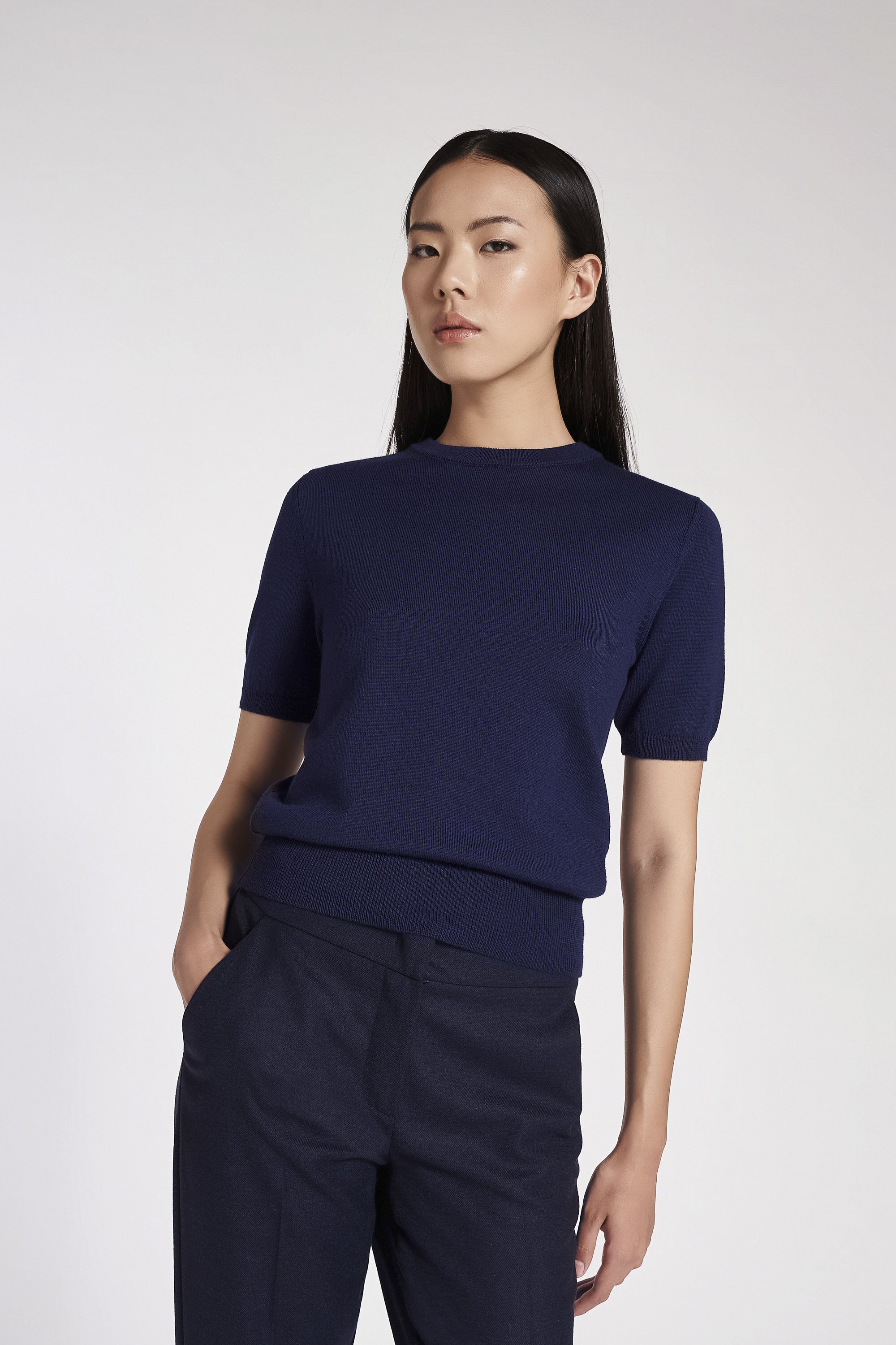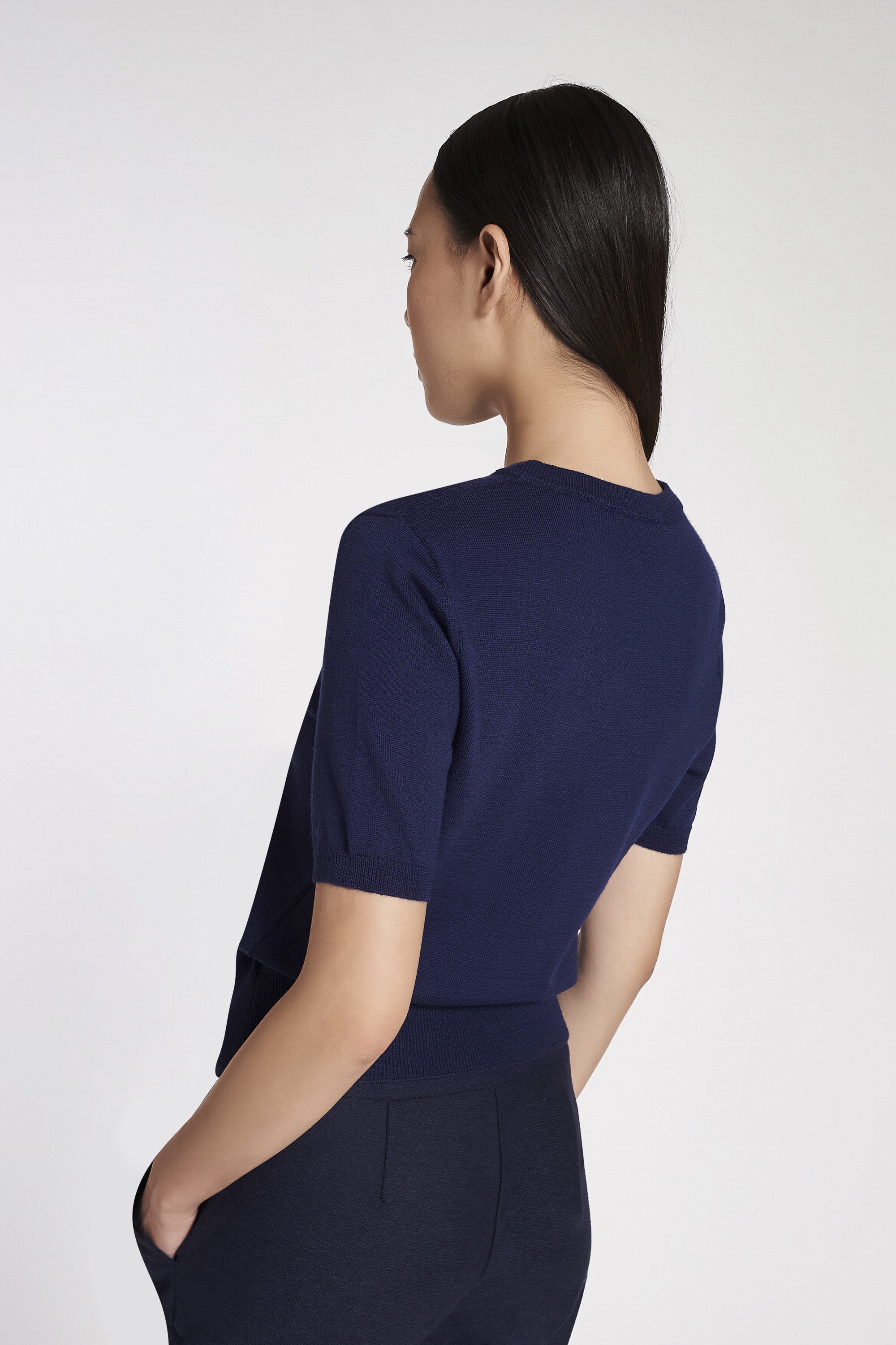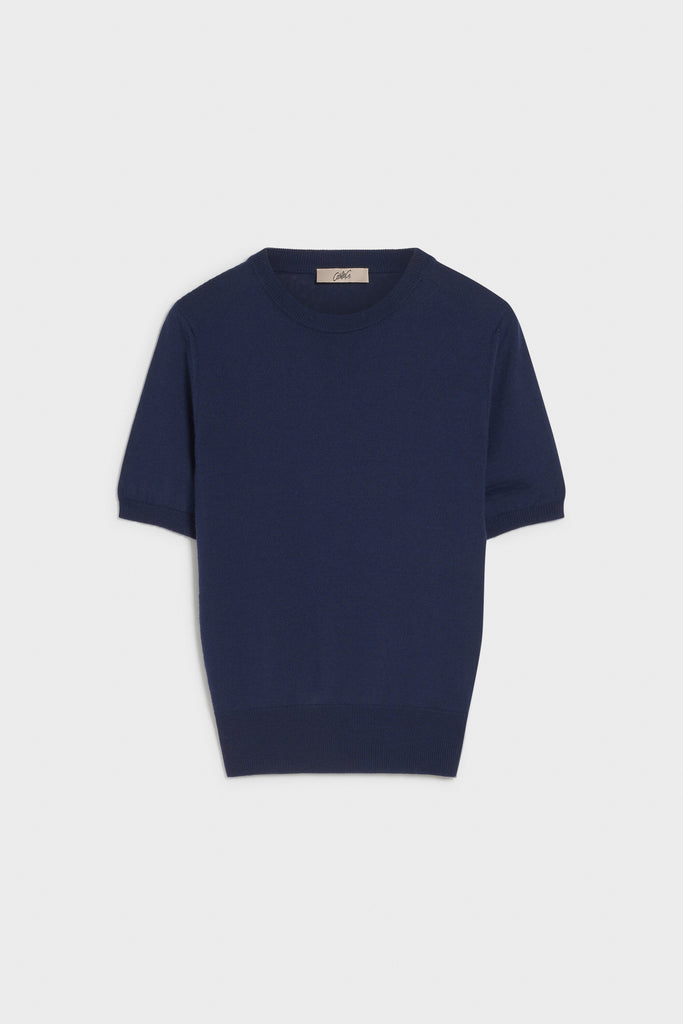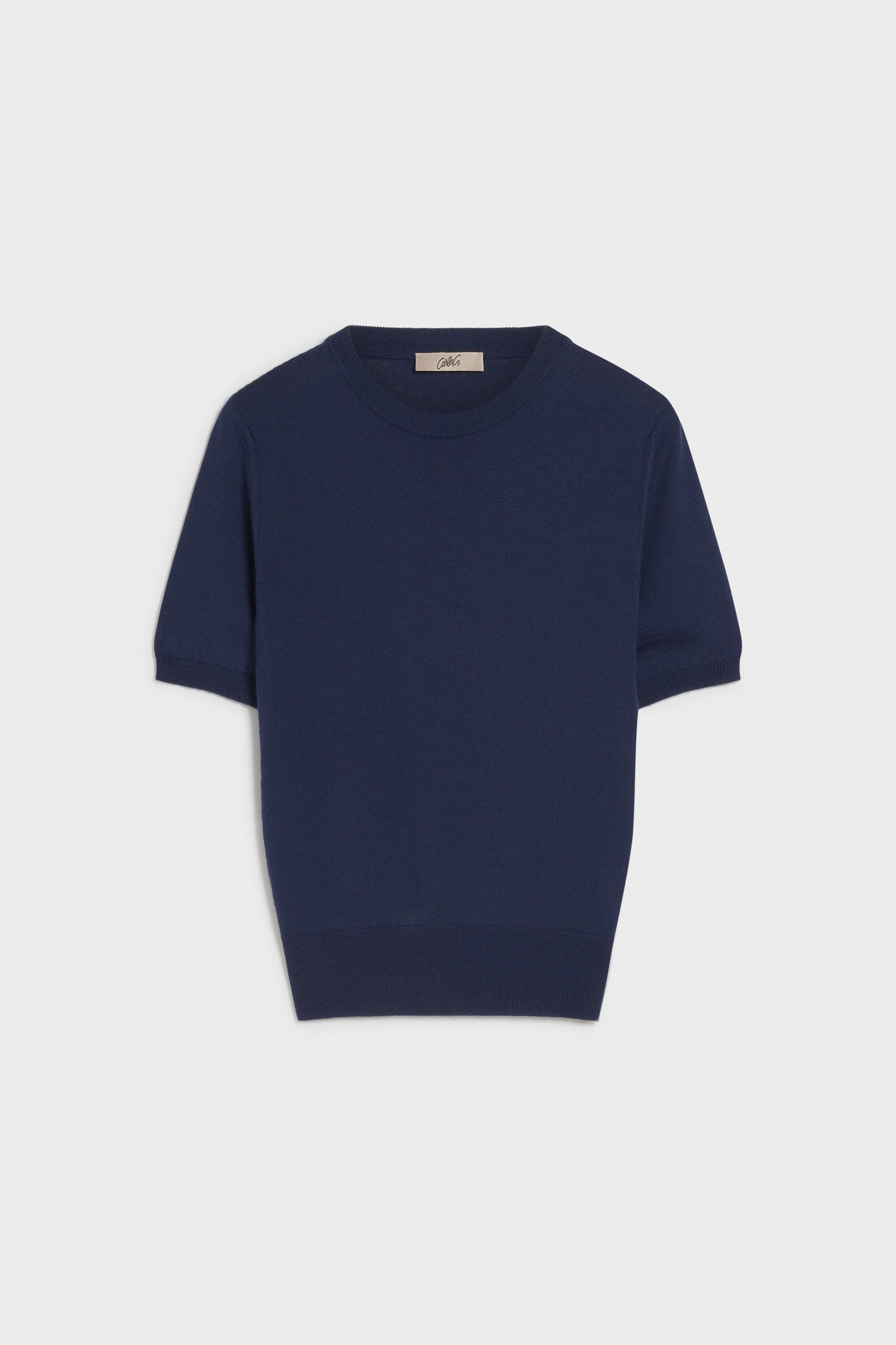 Maglia maniche corte aderente in lana merinos. Bordi a coste. Lunghezza sopra i fianchi.