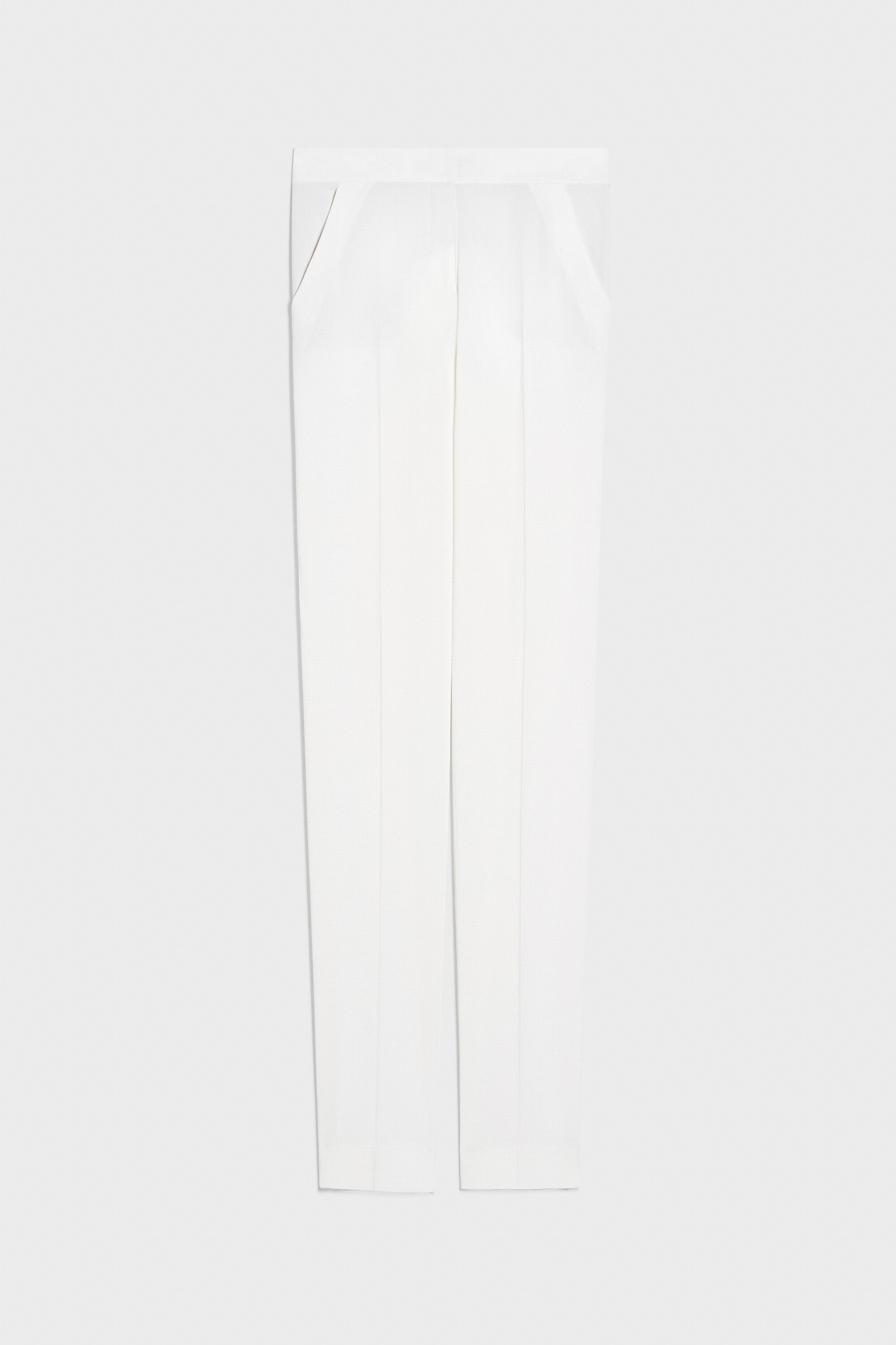 Pantalone carrot in crepe di viscosa elasticizzata, con vita regolare. Chiusura invisibile con lampo nascosta e gancio di metallo interno. Tasche inserite nei fianchi e piega stirata.