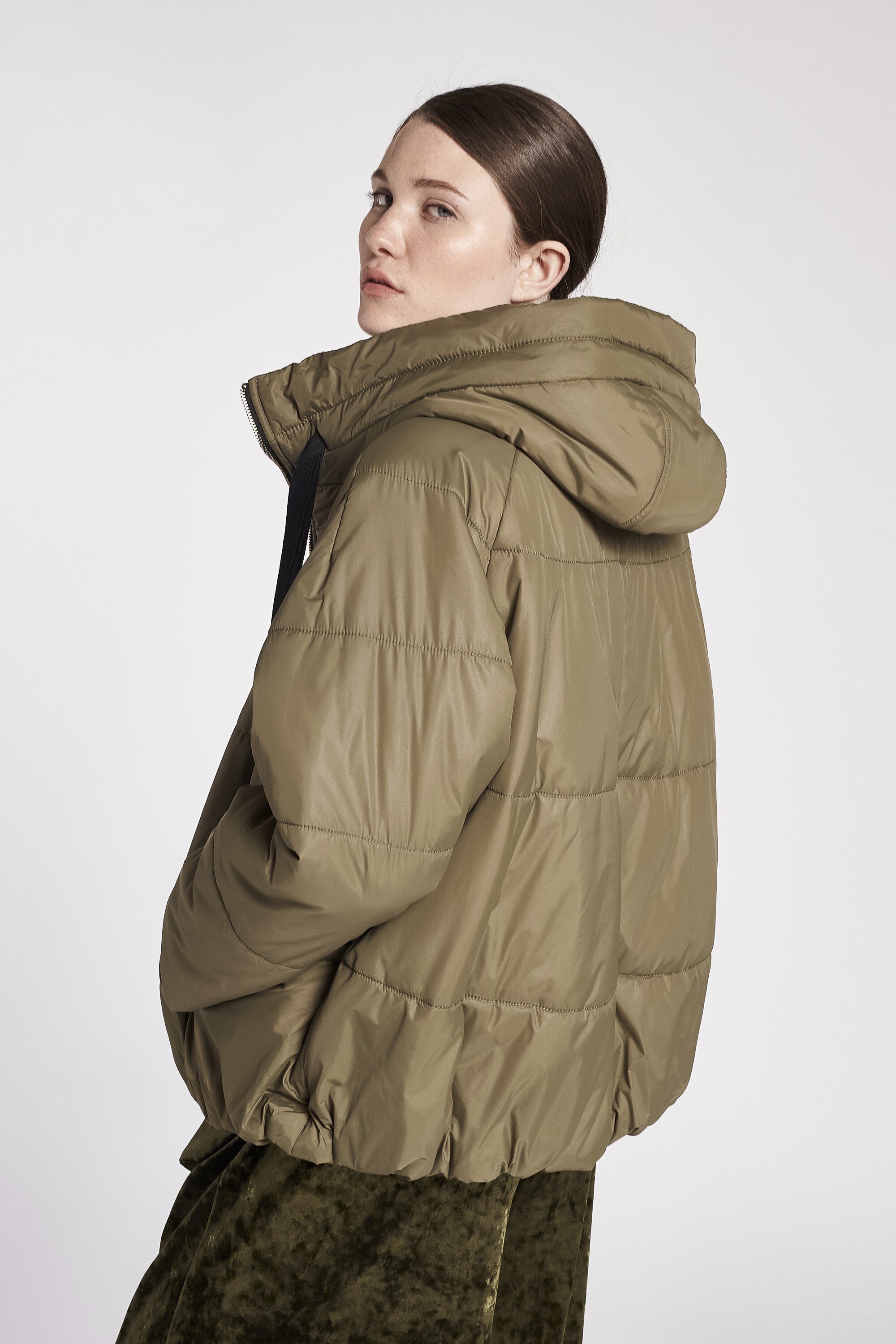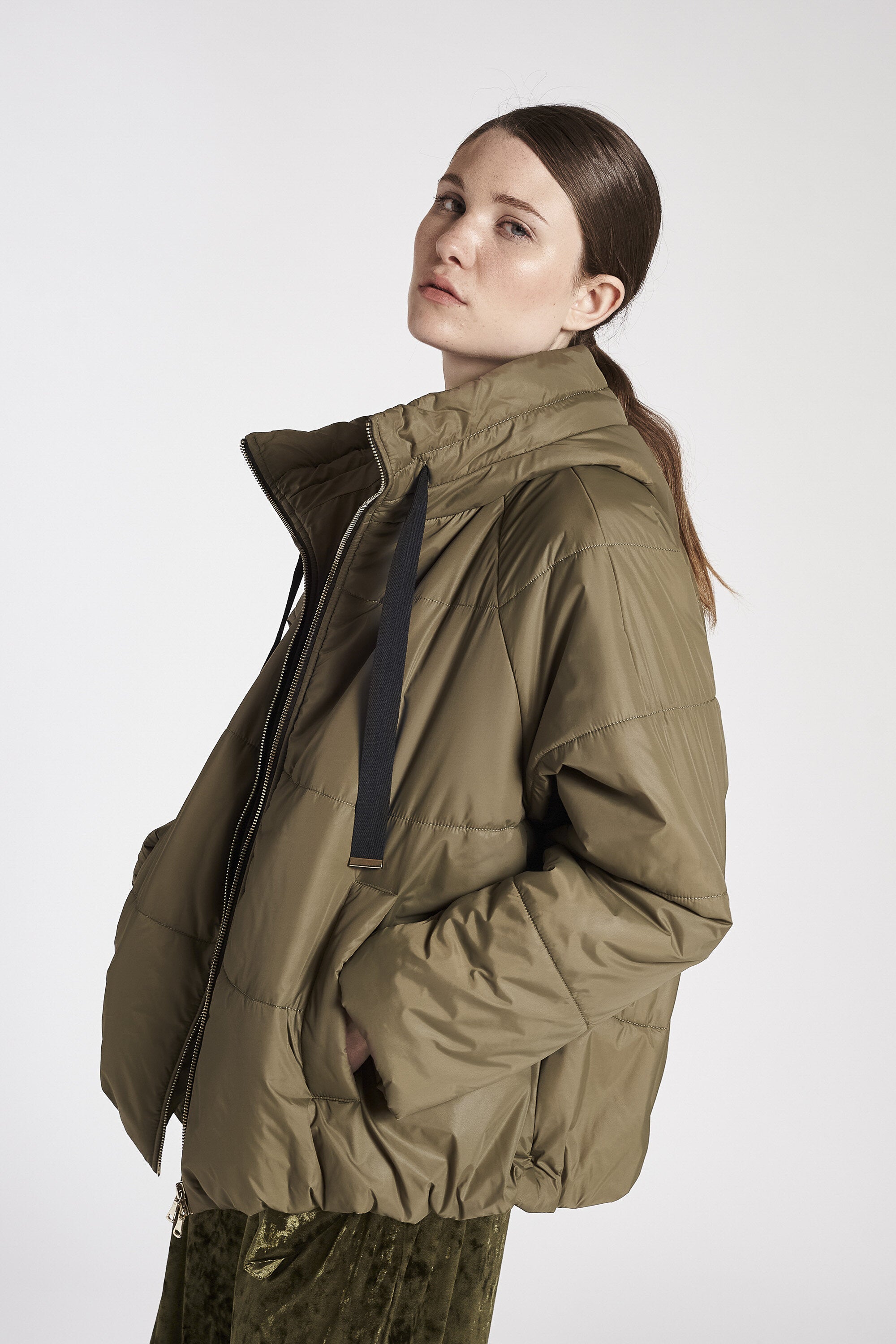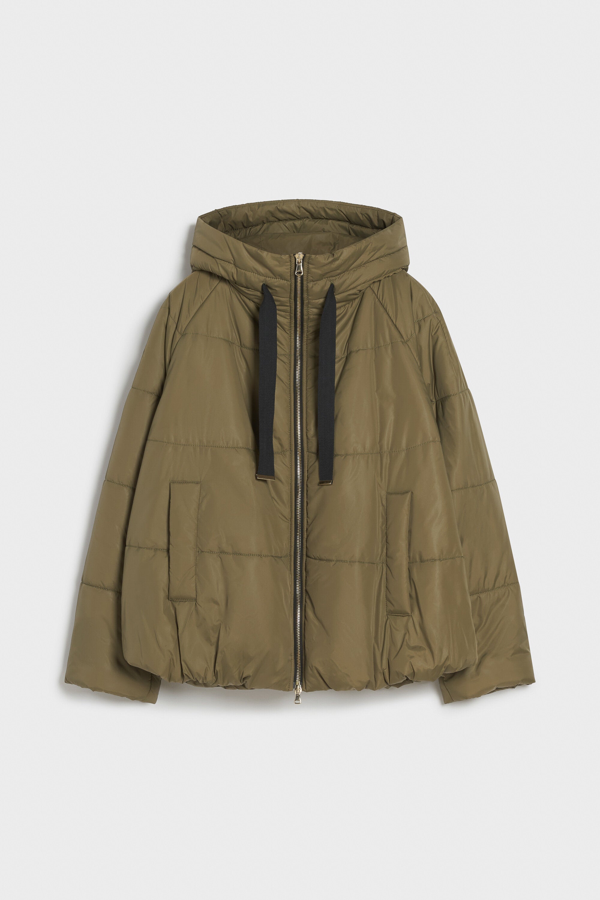 Piumino in nylon foderato e imbottito. Cappuccio con coulisse, allacciatura frontale con lampo di metallo e tasche a filetto. Lunghezza ai fianchi.