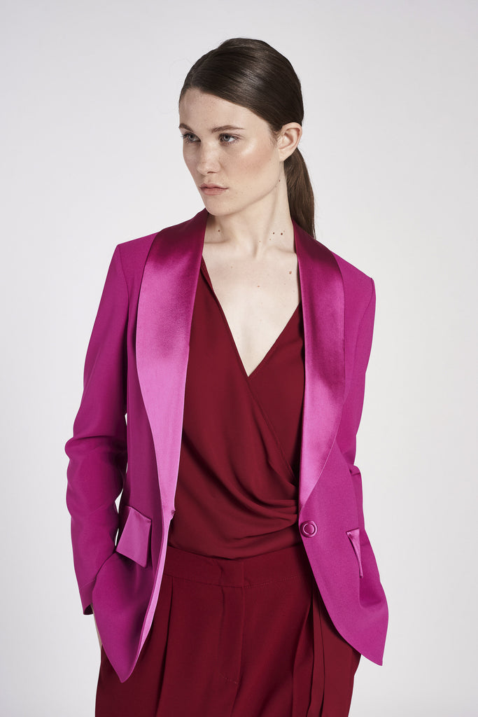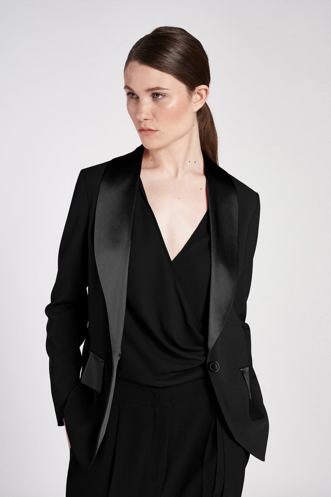 Blazer sfoderata in crepe di viscosa elasticizzato. Collo sciallato in tessuto a rovescio effetto...Learn more