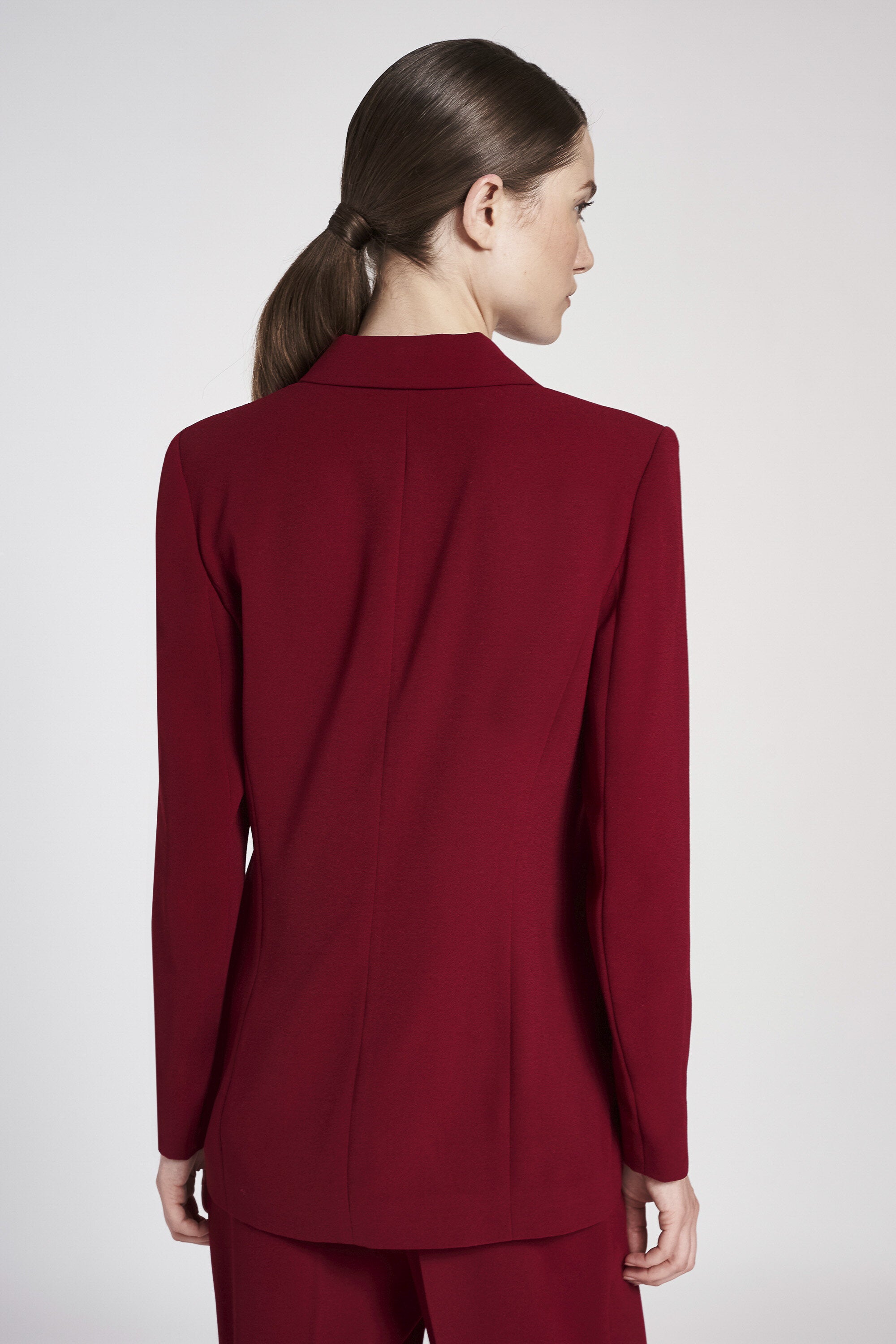Blazer doppiopetto foderato in crepe satin con collo con revers a lancia. Chiusura con bottoni ricoperti di tessuto. Patte applicate effetto tasca. Lunghezza sotto ai fianchi.