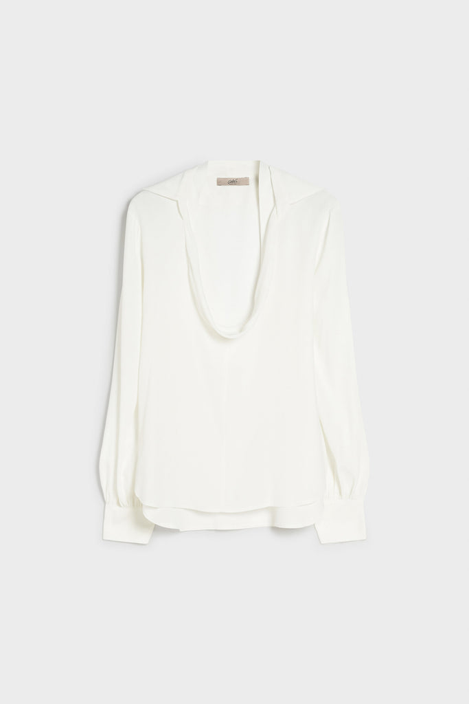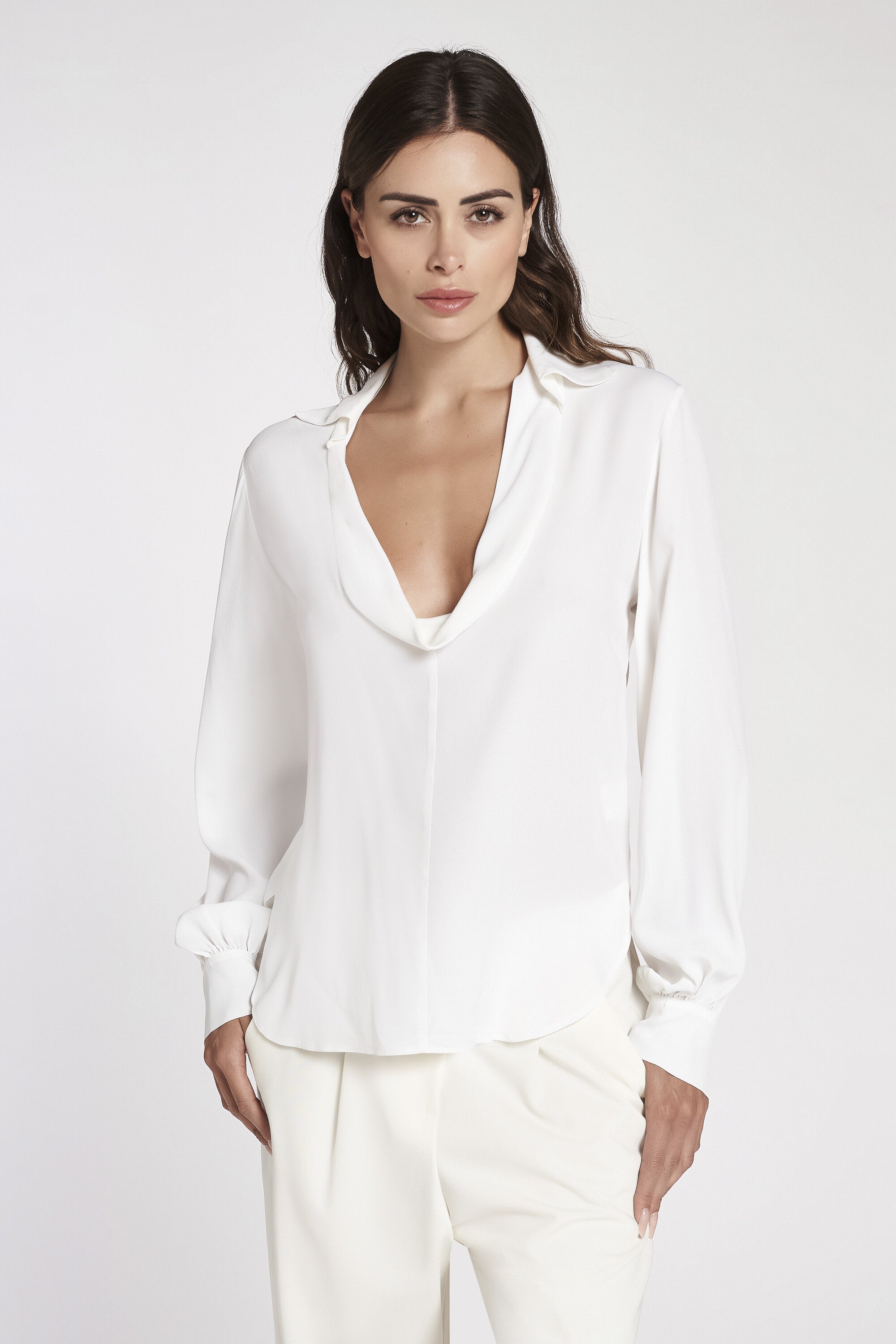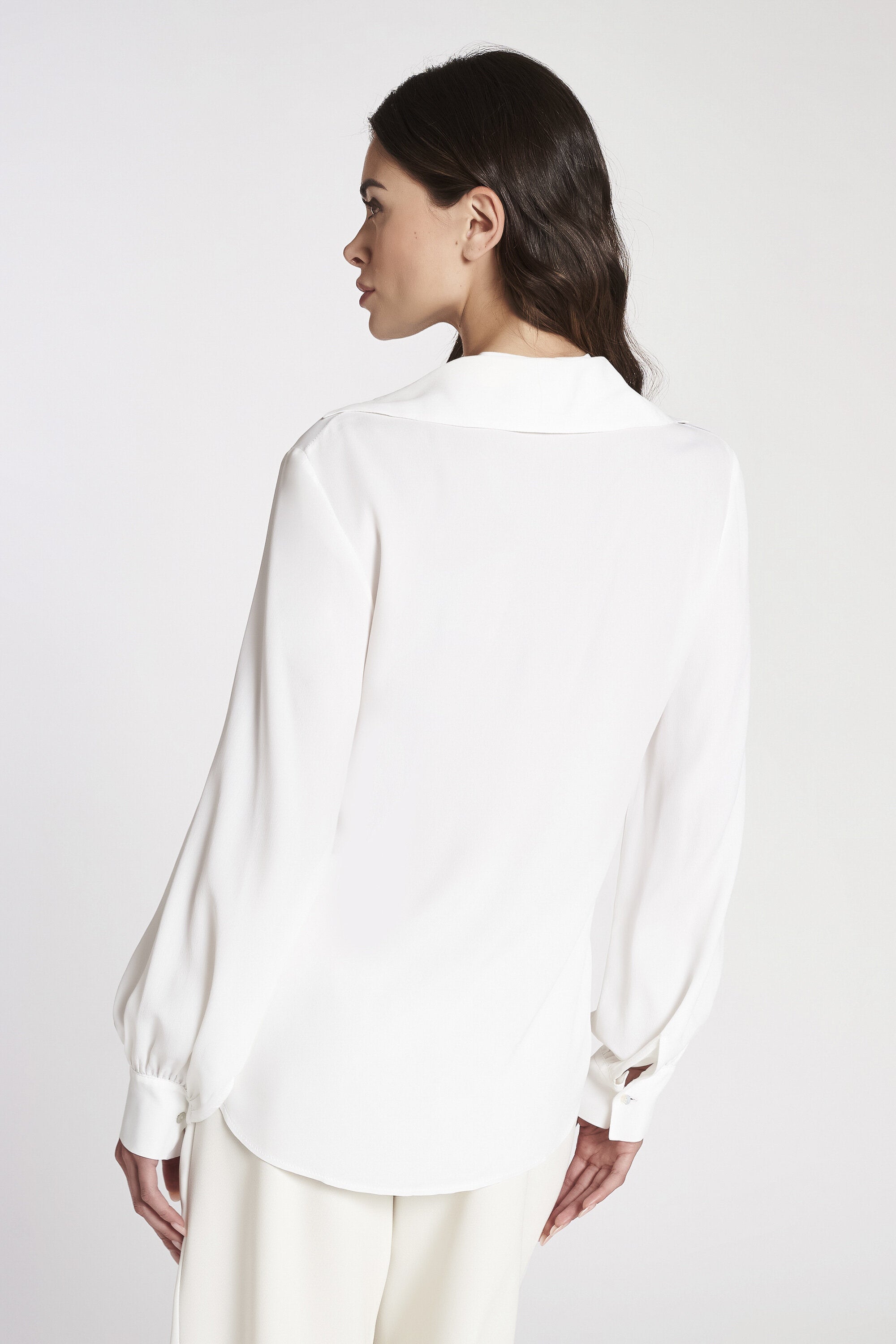 Camicia a maniche lunghe in crepe de chine. Doppio collo, classico e ad anello. Polsini chiusi da bottoni in madreperla. Fondo davanti più corto, lunghezza sotto i fianchi