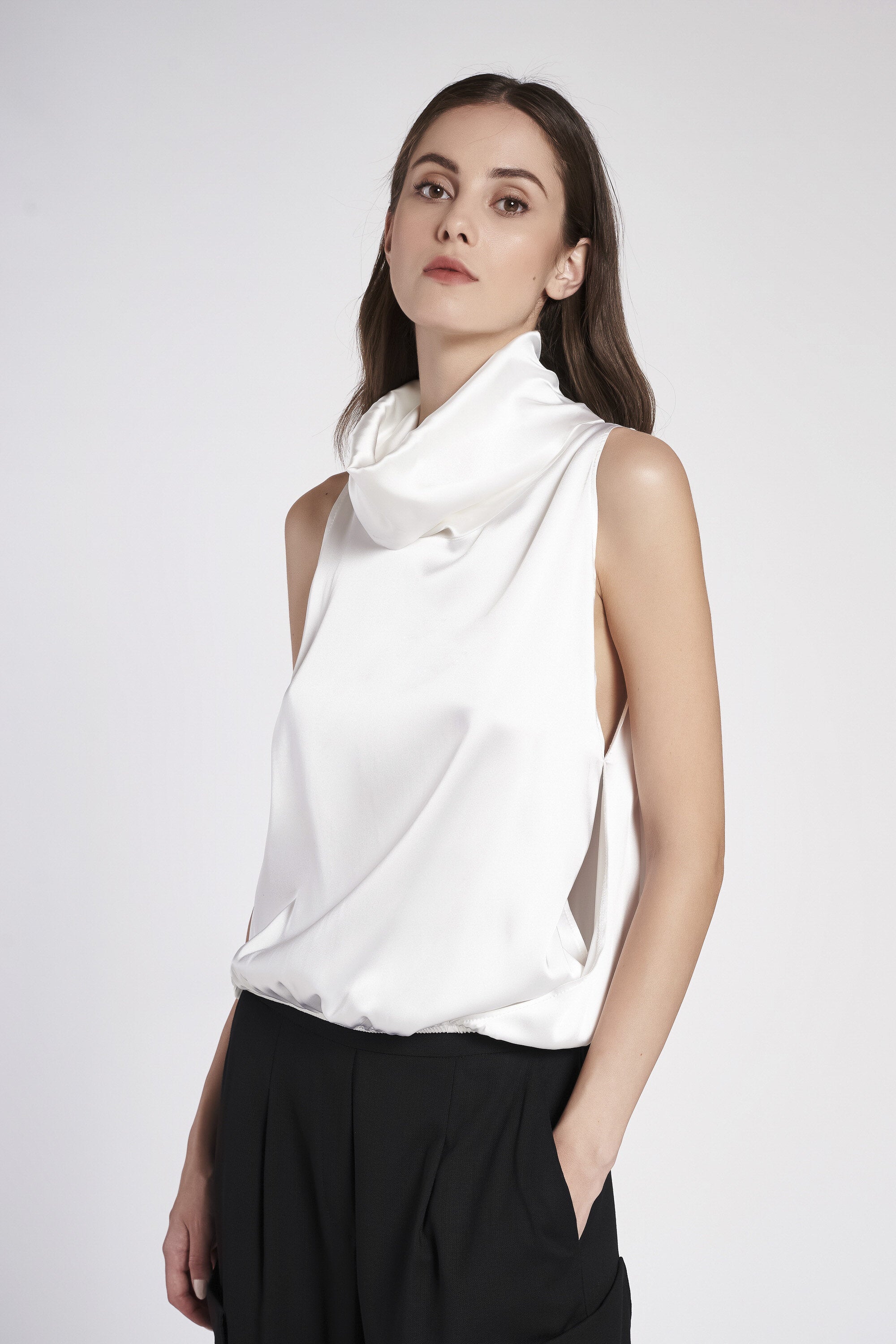 Maglia smanicata in raso elasticizzato a collo alto risvoltato. Elastico nel fondo. Lunghezza ai fianchi.