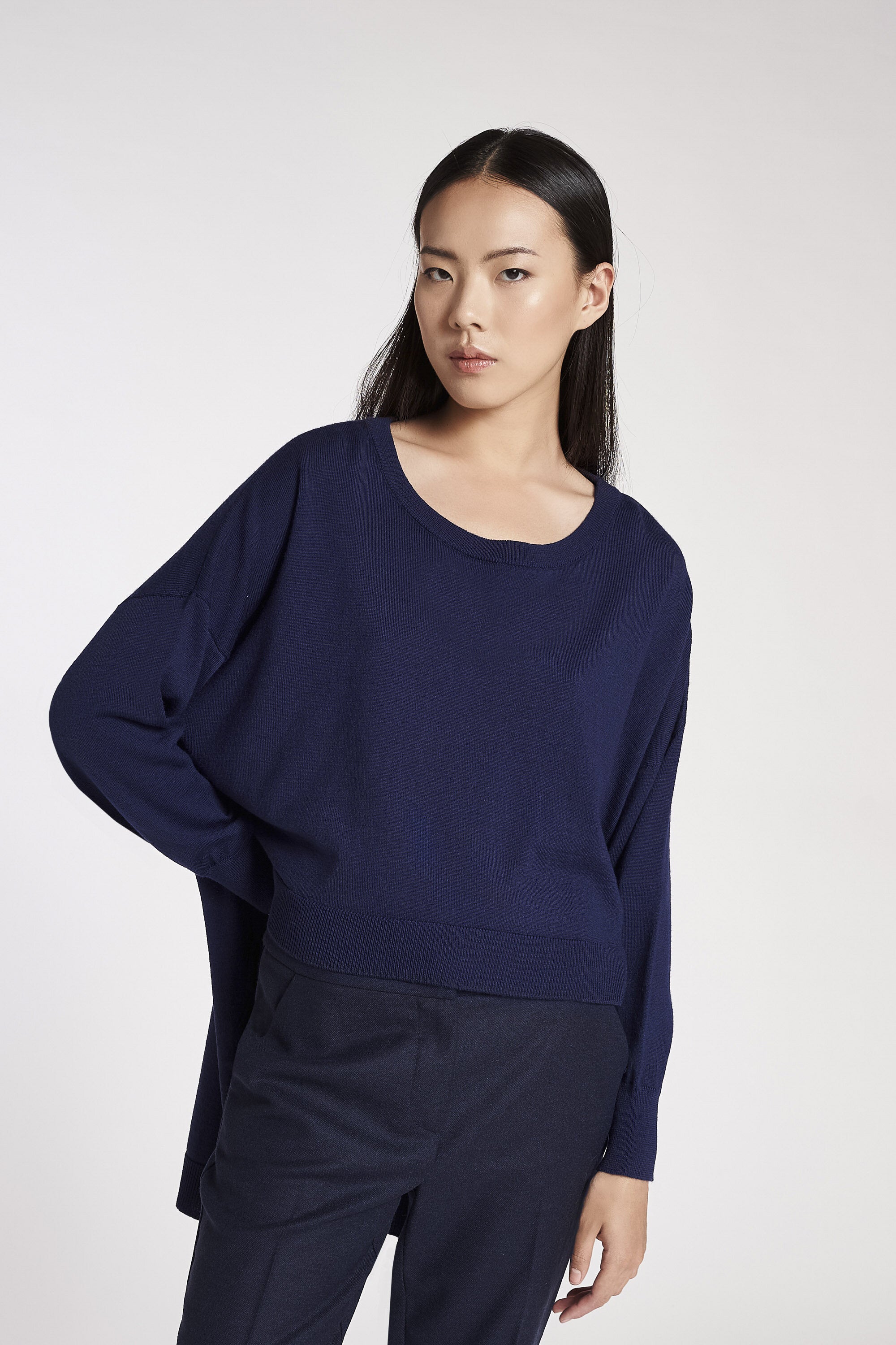 Maglia asimmetrica linea oversize a maniche lunghe in lana merinos con scollo a barchetta.