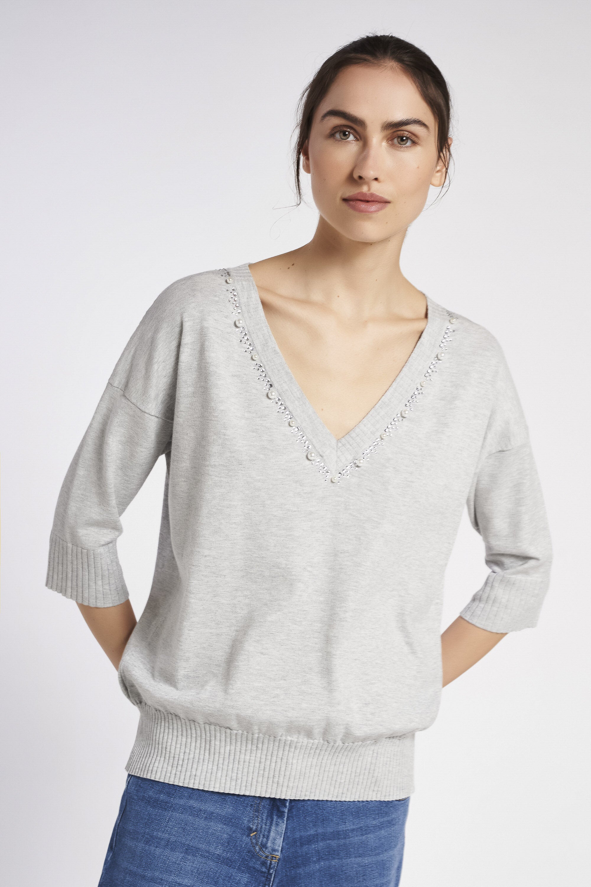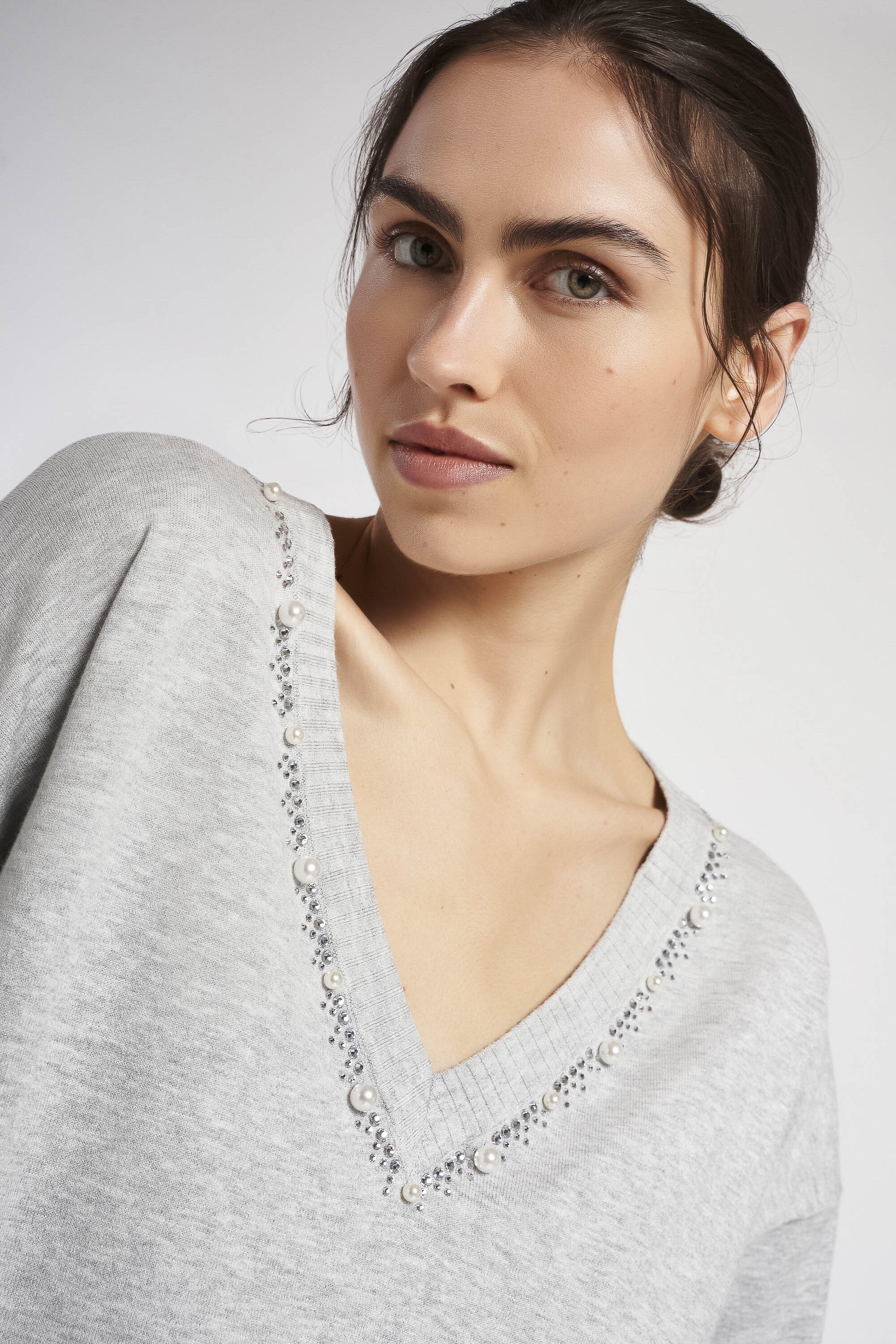 Maglia in viscosa elasticizzata con scollo a V impreziosito da perle e pietre. Scollo, polsini e fondo lavorati a coste. Lunghezza ai fianchi.