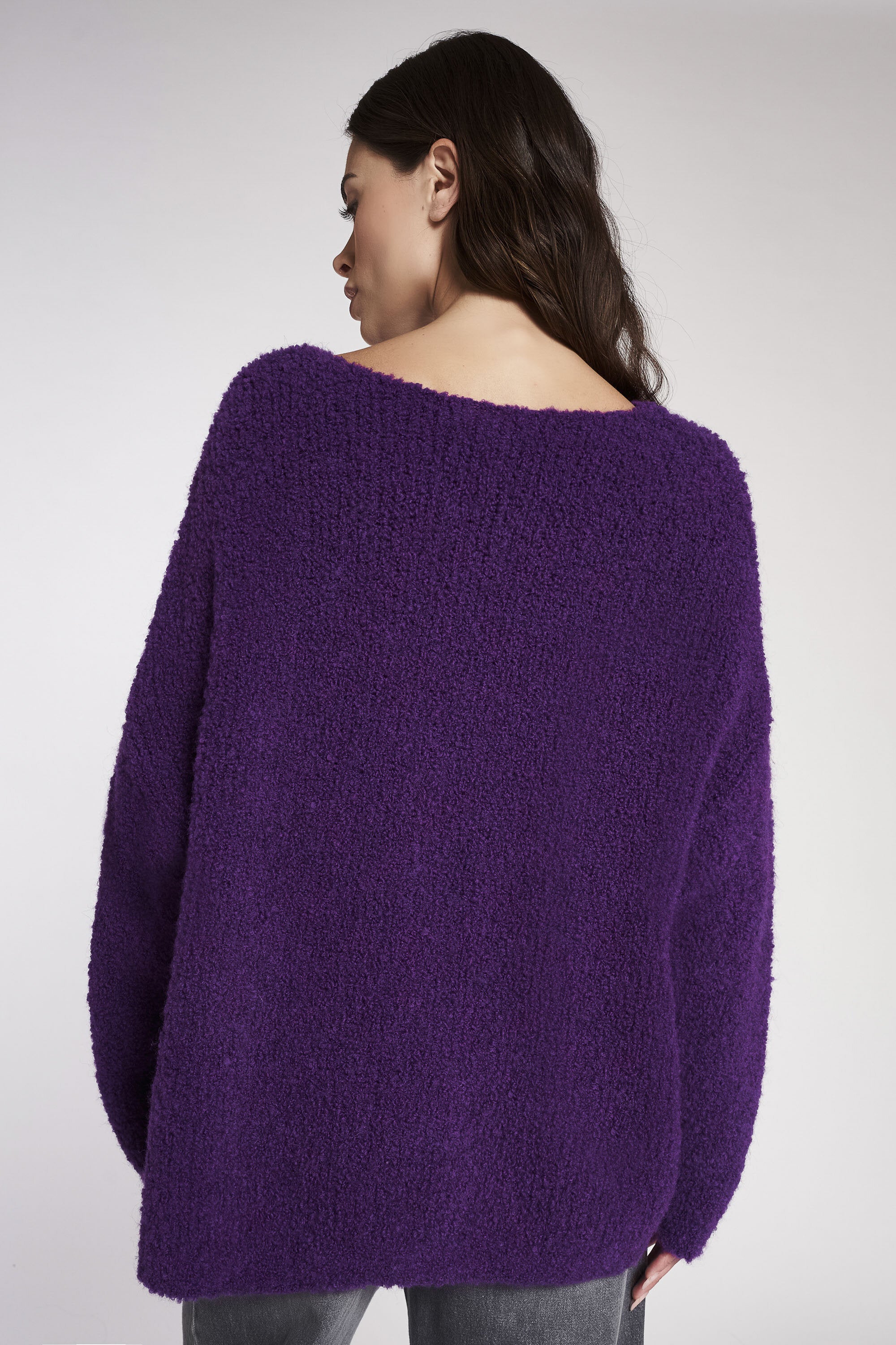Maglia in bouclè con scollo rotondo. Giromanica sceso. Fondo a coste. Lunghezza ai fianchi.