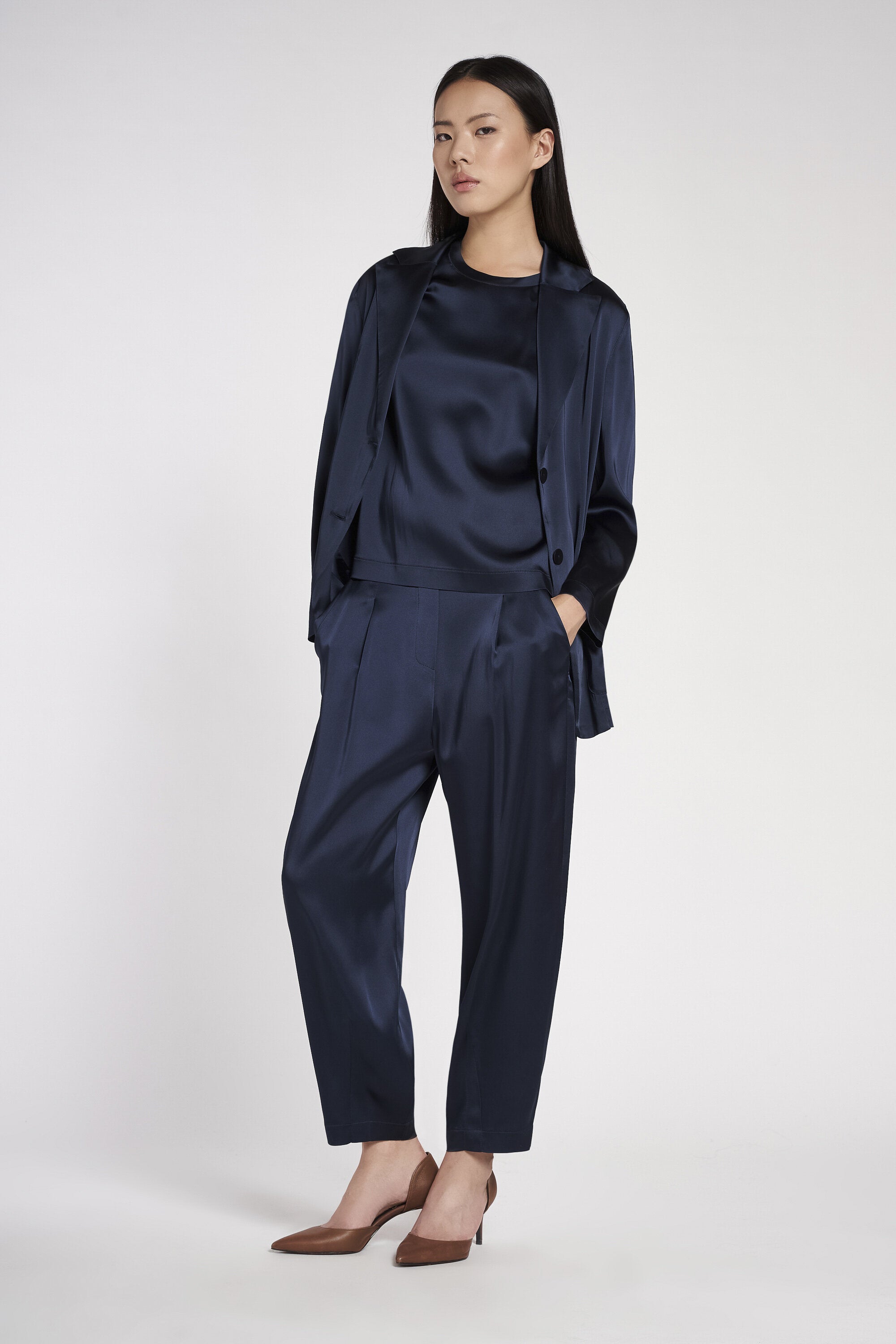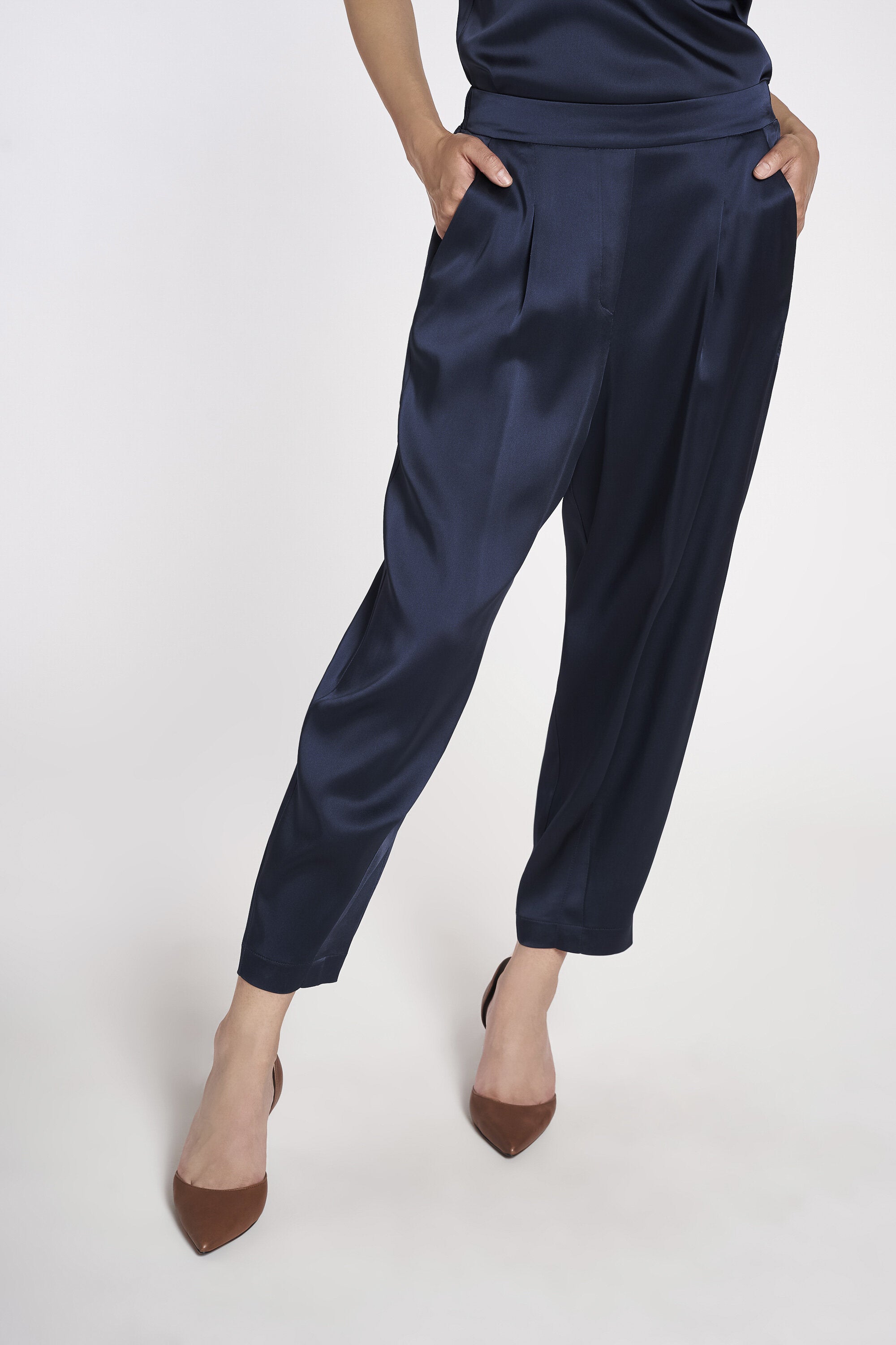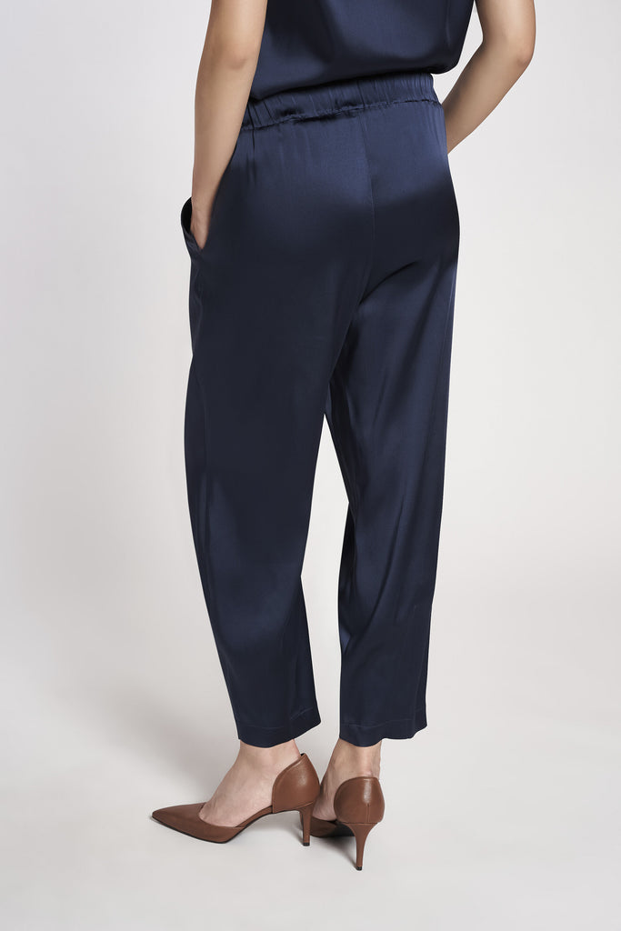 Pantaloni in raso elasticizzato con vita regolare e cavallo basso. Vita davanti con finta apertur...Learn more