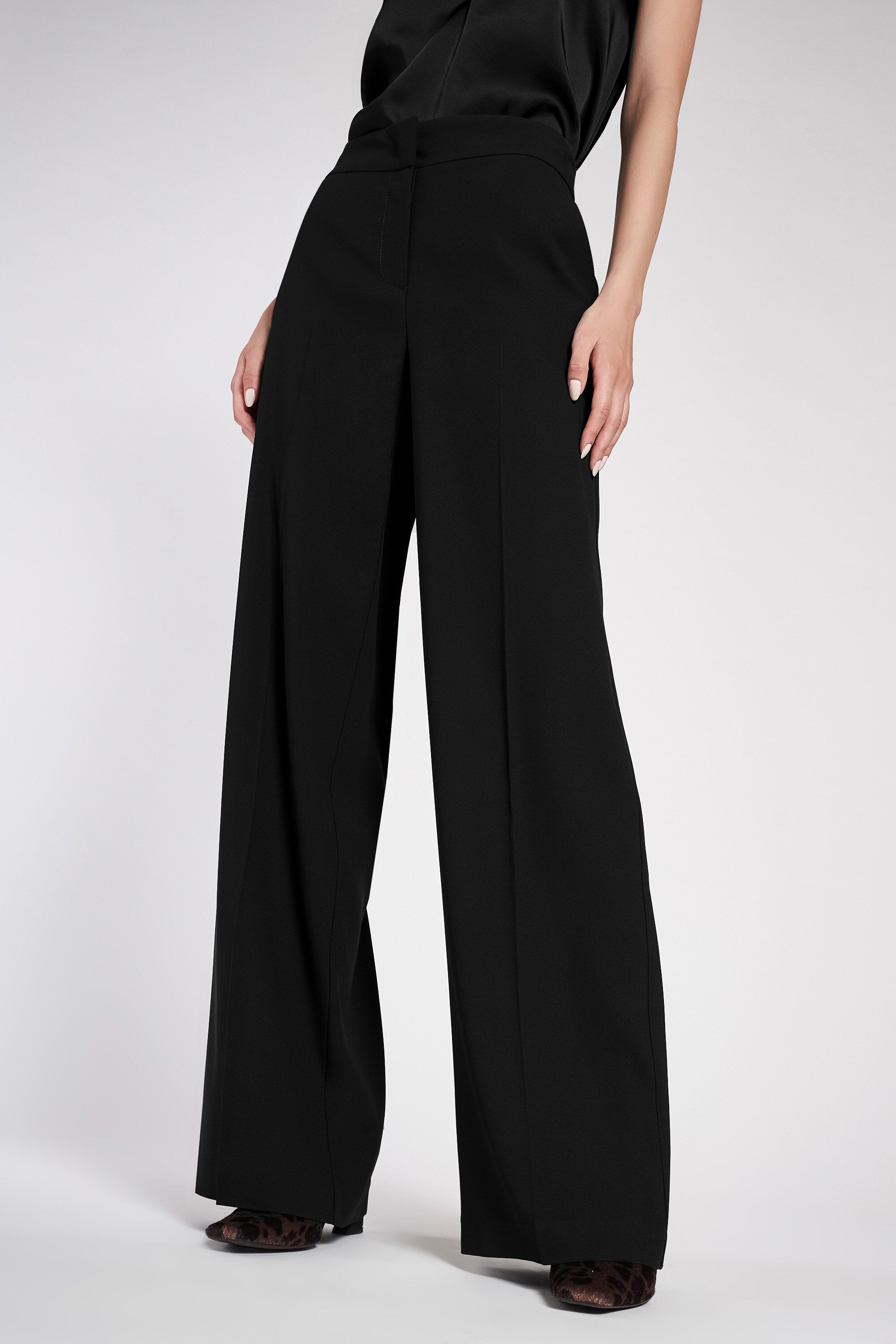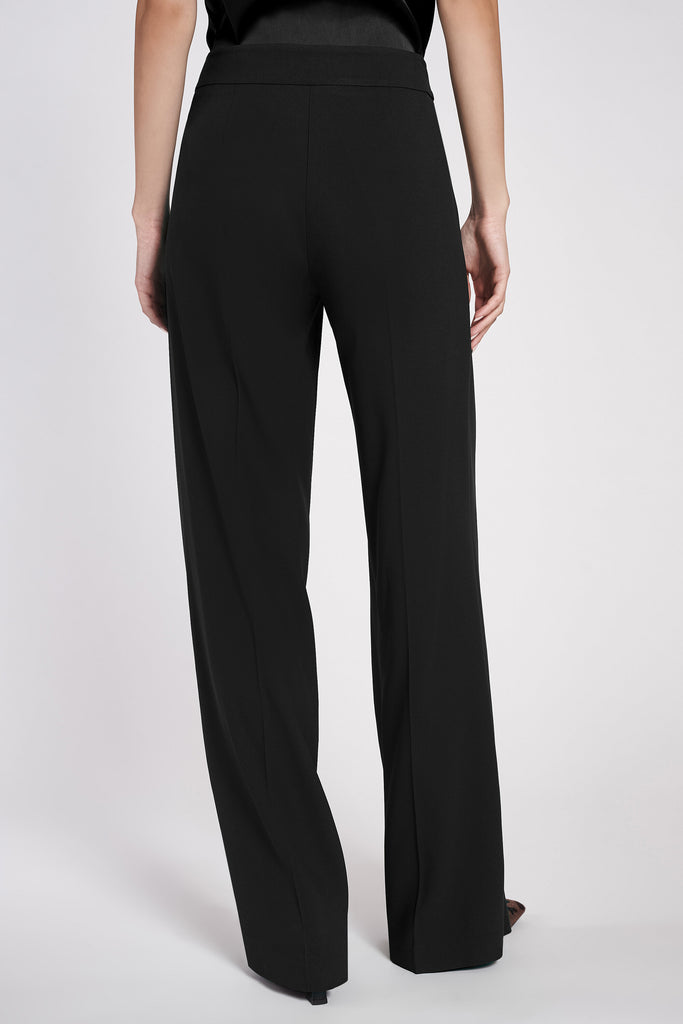 Pantaloni larghi in crepe di viscosa elasticizzato con vita regolare. Chiusura invisibile con lampo nascosta e gancetto di metallo interno. Tasche alla francese e piega stirata.