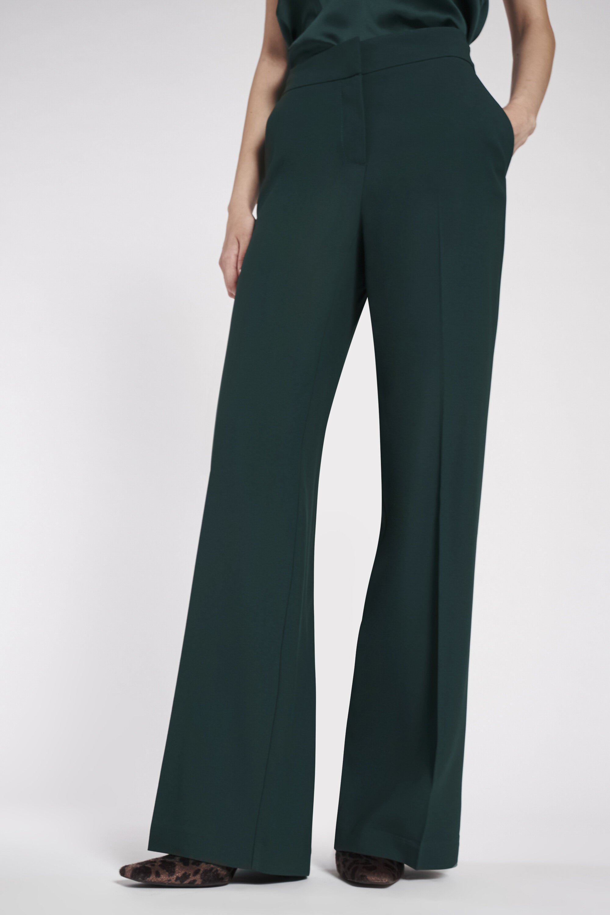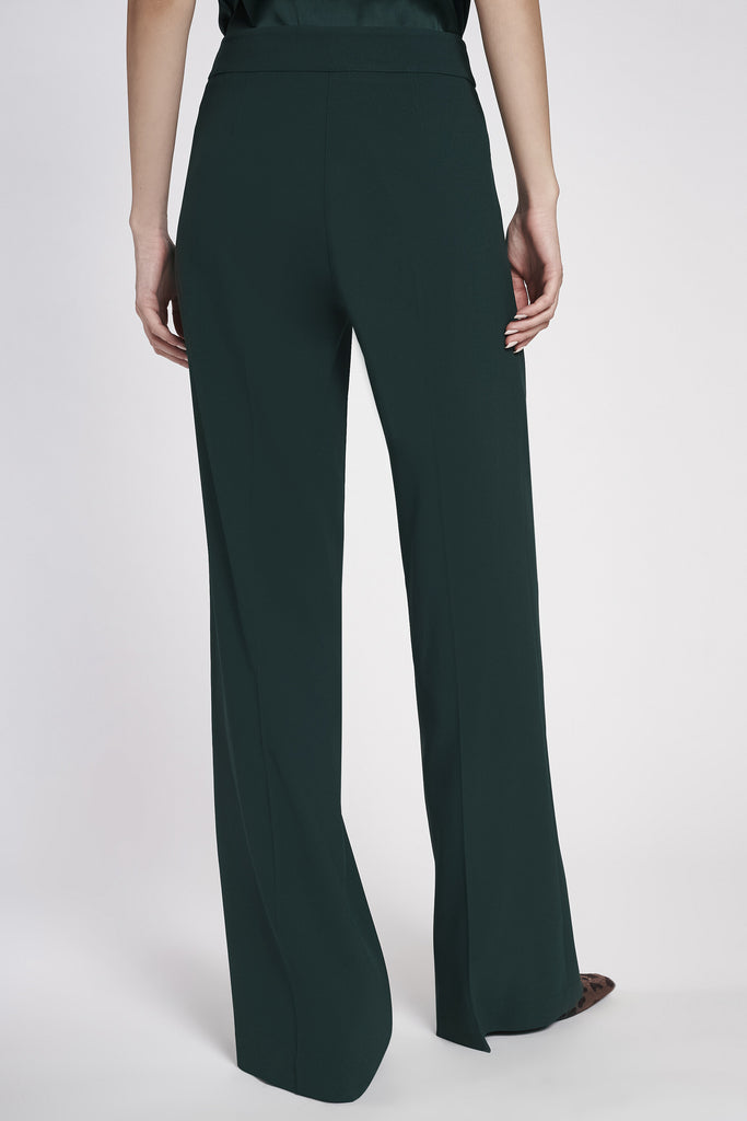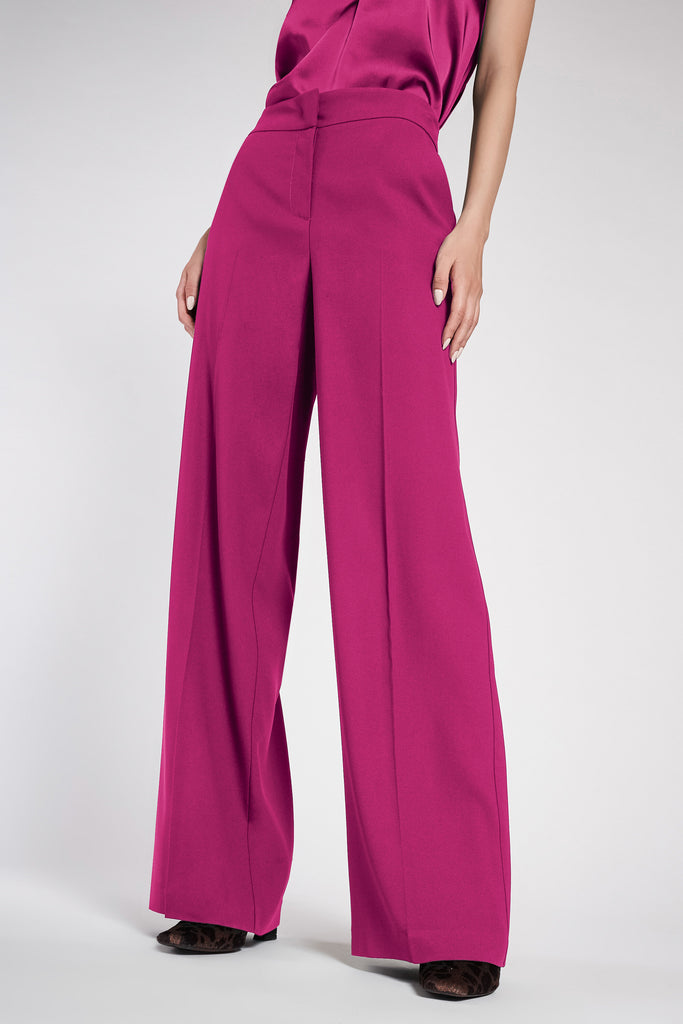 Pantaloni larghi in crepe di viscosa elasticizzato con vita regolare. Chiusura invisibile con lampo nascosta e gancetto di metallo interno. Tasche alla francese e piega stirata.